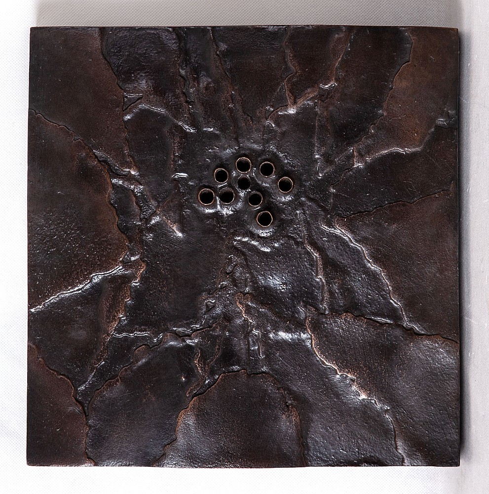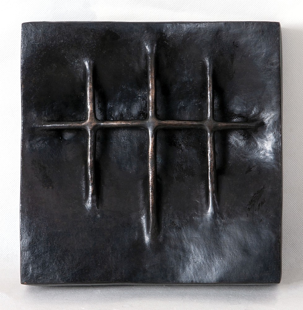 bronz, 2010, 24,5 x 24,5 cm, monogr. zezadu JZ 10, bronzový reliéf je ukázkou sochařského uvažování Jasana Zoubka, které se vyznačuje úspornou formou a důrazem na hloubku obsahu. Autor v tomto díle pracuje s motivem kříže, který nepojímá pouze jako tradiční symbol, ale jako strukturální prvek organi…