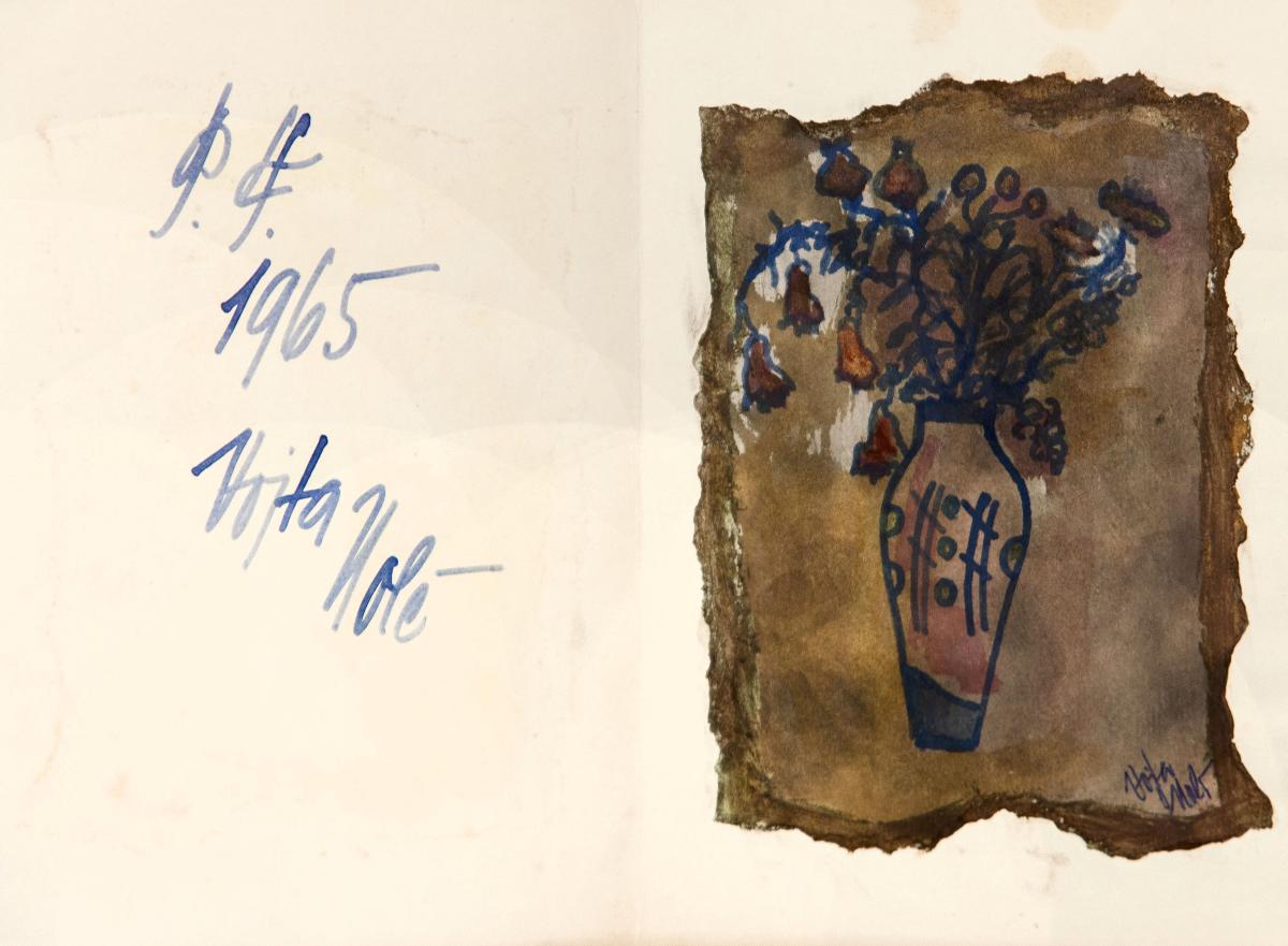 akvarel, fix, papír, 1964, 23,9 x 32,6 cm, sign. PD Vojta Holč, na pravé polovině malba květin, na levé polovině text: p. f. 165 Vojta Holč, papír ušpiněn, papír uprostřed přeložený, Aantiqari.at Radhošťská,