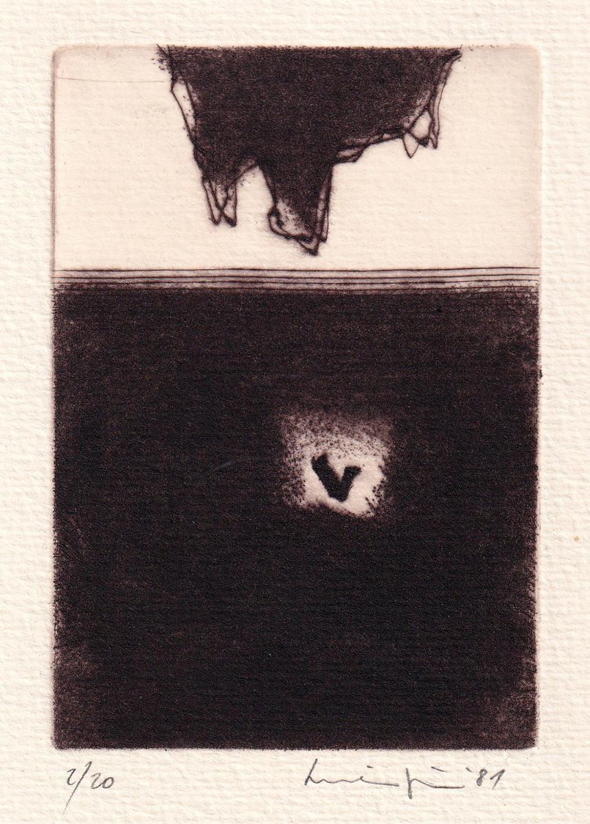 suchá jehla, 1981, 11 x 7,6 cm, sign. PD Jiří Mika, č. 2/20, ze souboru Cirkus 82, vyšlo nákladem autorů jako neprodejný tisk v počtu 60 výtisků, Praha 1982, Provenance: Antiquarian Dlážděná, the disciple of prof. Hnizdo, member of Nova skupina