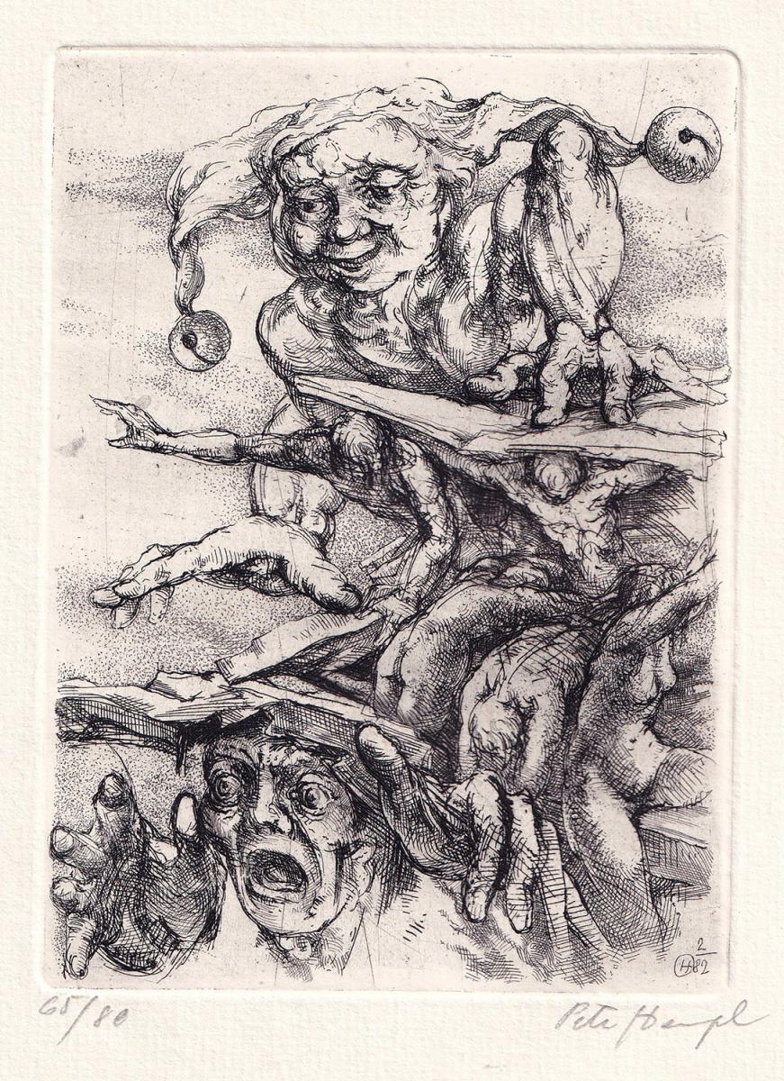 suchá jehla, 1982, 17 x 17 cm, sign. PD Pavel Hlavatý 82, na zadní straně razítko autora, ze souboru Cirkus 82, vyšlo nákladem autorů jako neprodejný tisk v počtu 60 výtisků, Praha 1982, Provenance: Antiquarian Dlážděná