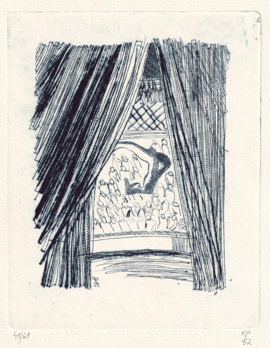suchá jehla, 1982, 21 x 17,1 cm, monogr. PD KP 82, č. 41/61, ze souboru Cirkus 82, vyšlo nákladem autorů jako neprodejný tisk v počtu 60 výtisků, Praha 1982, Provenance: Antiquarian Dlážděná, disciple of Prof. G. Singier at École Nationale Supérieure des Beaux-Arts in Paris, later studied at École d…