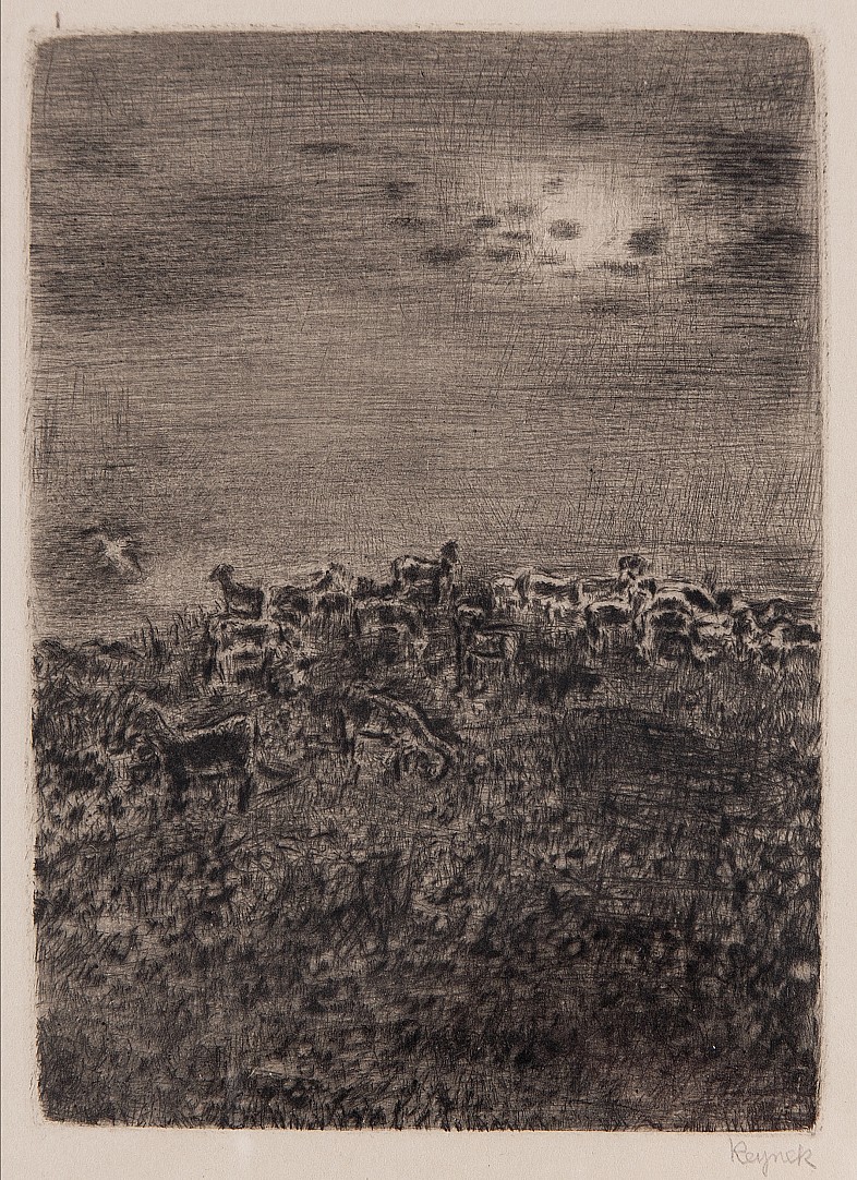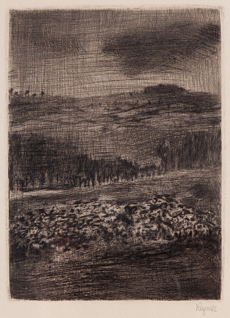 suchá jehla, 1947, 12,5 x 9 cm, sign. PD Reynek, rám, z Cyklu 12 suchých jehel " Pastorale" vydaný V. Vokolkem v popisek: Z 1947. Desky z cyklu byly ryty již dříve, v letech 1942-45, tištěny pak a vydány v. roce 1947., soukromé studium, člen SČUG Hollar, Svazu čsl. výtvarných umělců a Synd…