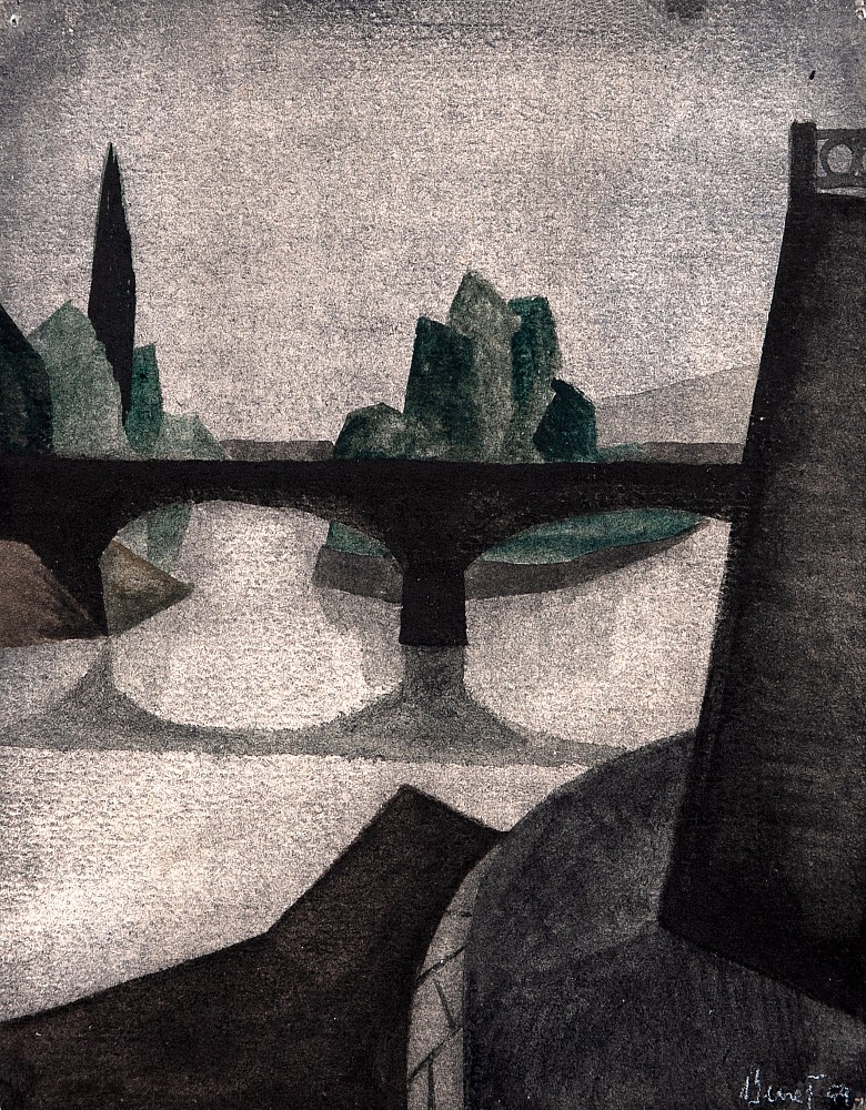 akvarel, papír, 29,5 x 28,2 cm, rám, vzadu razítko: Z pozůstalosti Vlastimila Beneše, dále razítko znalecké Alexandr Vosatka, studied at Charles University and The Academy of Arts, Architecture and Design in Prague, the private study at the atelier of E. Frinta, member of the group Maj 57