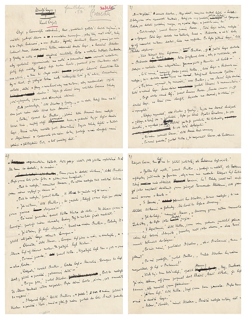 rukopis, 21 x 17 cm, rukopis povídky Římské legie o pěti stranách, signováno pod titulem na první straně, přípis tužkou Beseda 1928, povídka vyšla jako součást knihy Apokryfy vydané v roce 1932, 5x volný list, dobrý stav, Provenance: Antiquarian Dlážděná