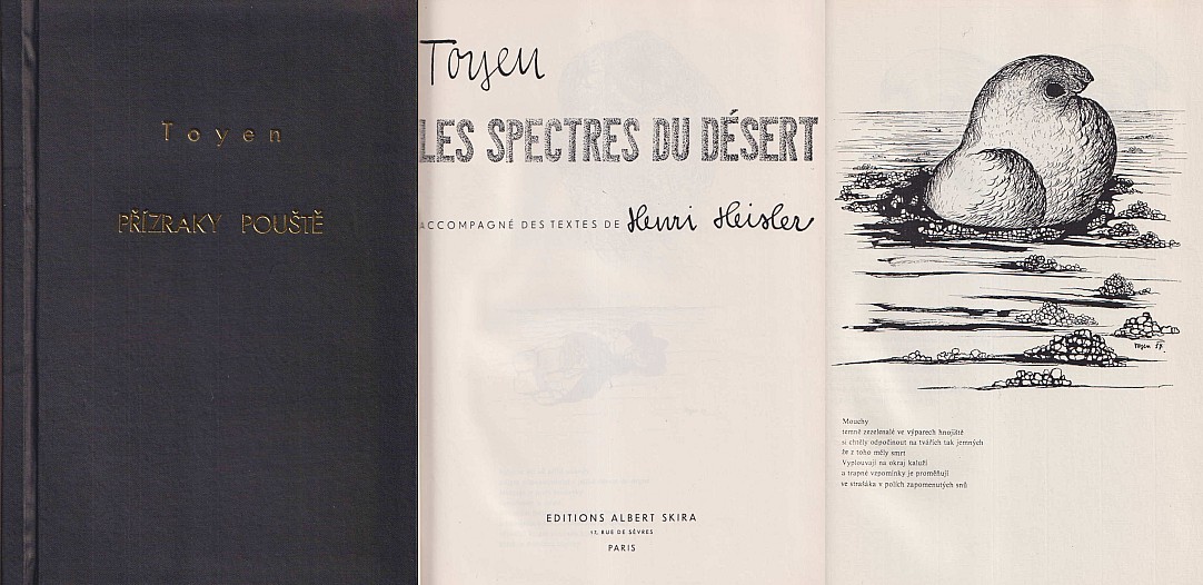 bibliofilie, na patitulu přípis Ludvíku Kunderovi Heisler Básně z cyklu 12 kreseb Toyen z let 1936-1937. Věnováno Teigovi. Překlad do francouzštiny J. Hořejší. Praha, Edice surrealismu 1939. Vyšlo pod krycí hlavičkou pařížského nakl. A. Skira. fotokopie původního výtisku Les spectres du désert (Pří…