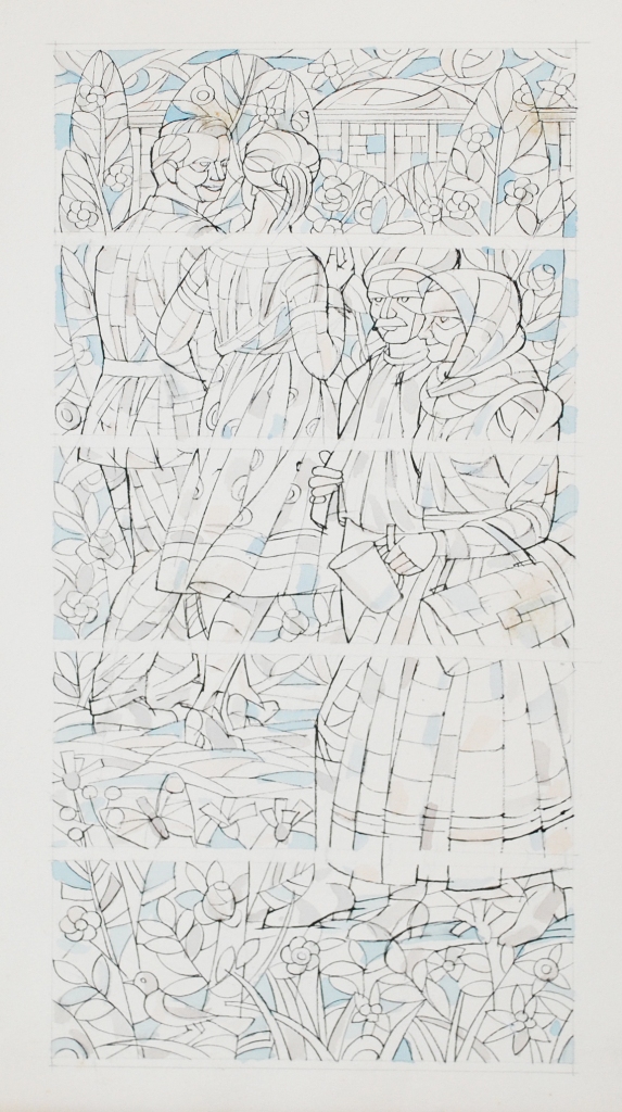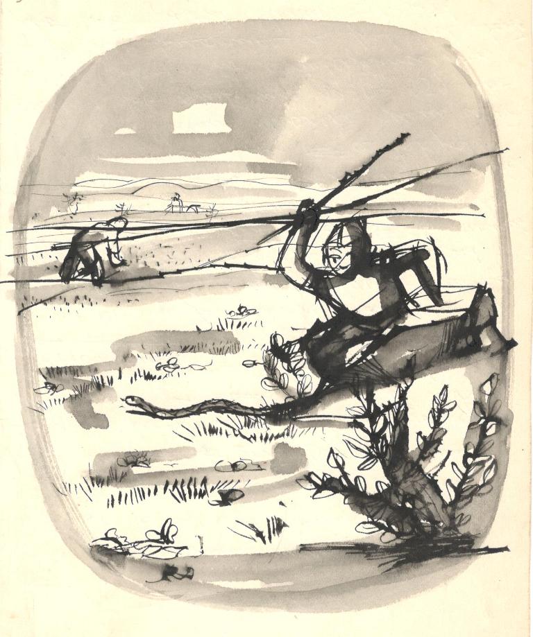 lavírovaná tuš, běloba, papír, 10 x 21 cm, návrh knižní obálky, lehce zažloutlý papír, Aantiqari.at Radhošťská,