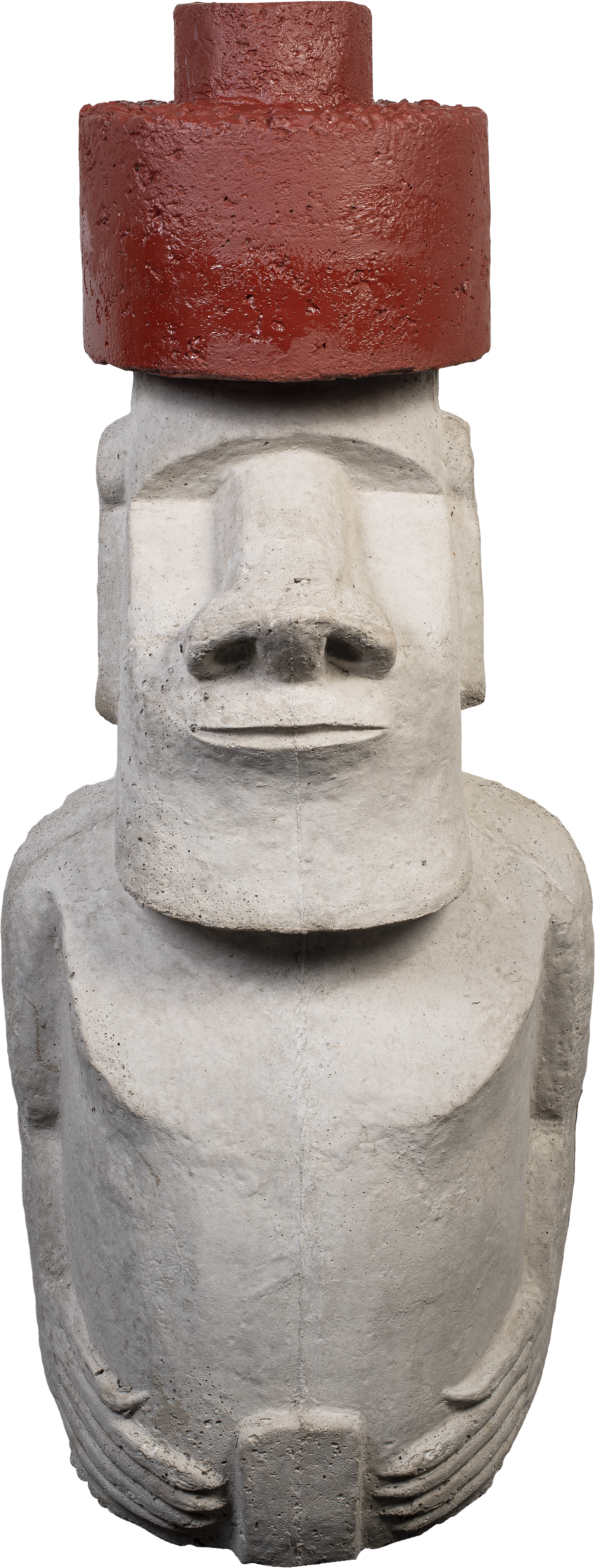 železobetonová replika sochy moai s kloboukem pukao z Velikonočního ostrova, 250 kg socha + 30 kg klobouk, 2022, 139 x 56 x 35 cm, vzadu + certifikát