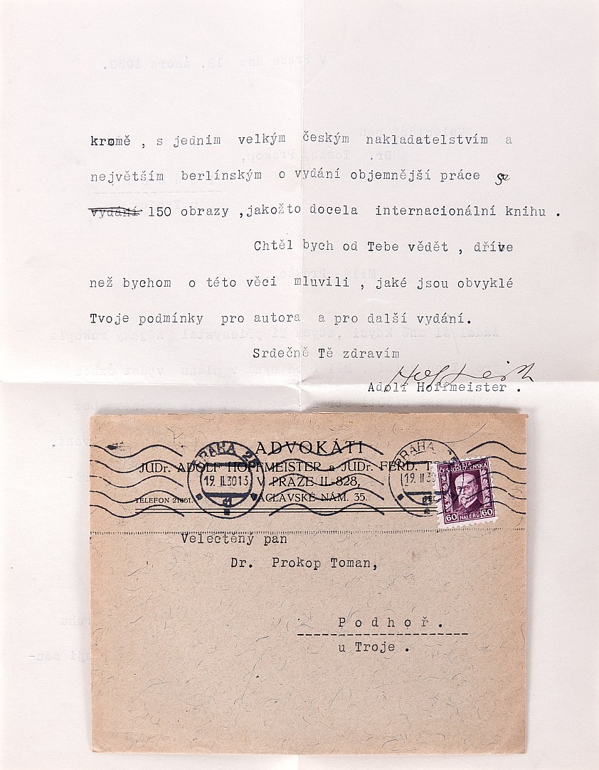 dopis, 1930, 28,5 x 22,1 cm, Strojopisný dopis s podpisem z 18.února 1930, v původní obálce., Provenance: Antiquarian Dlážděná, the constituent member of Devetsil, ex-commisary of UNESCO