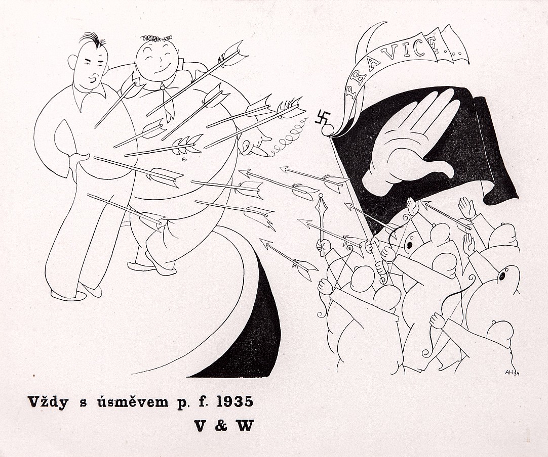 kniha, protifašistické karikatury a kresby pěti čs. výtvarníků, 20 kreseb a koláží A. Hoffmeister, A. Pelc, monogr. Z.K., W. Trier a Stephen, předmluva David Low, ob. A Hoffmeister, vydal John Murray, London 1944, 64s., ob. potrhaná, na hřbetu kus chybí, velmi dobrý stav, Provenance: Antiquarian Ost…