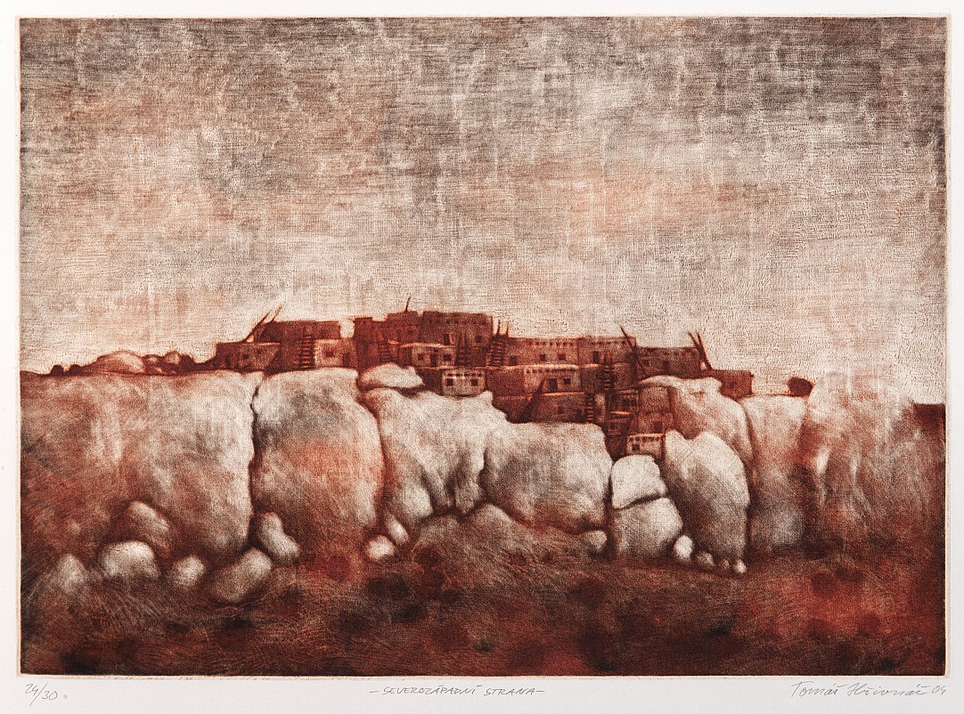 mezzotinta, 2004, 34,5 x 49 cm, sign. PD Tomáš Hřivnáč 2004, č. 24/30, Vzpomínka z Nového Mexika; v grafice Severozápadní strana se Tomáš Hřivnáč obrací k poetice krajiny. Na ploše, laděné do teplých hnědočervených tónů, se zvedá skalní masiv, na jehož hraně se tísní lidská obydlí. Atmosféra díla vy…