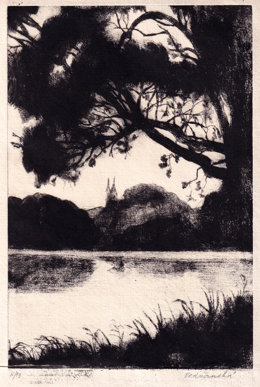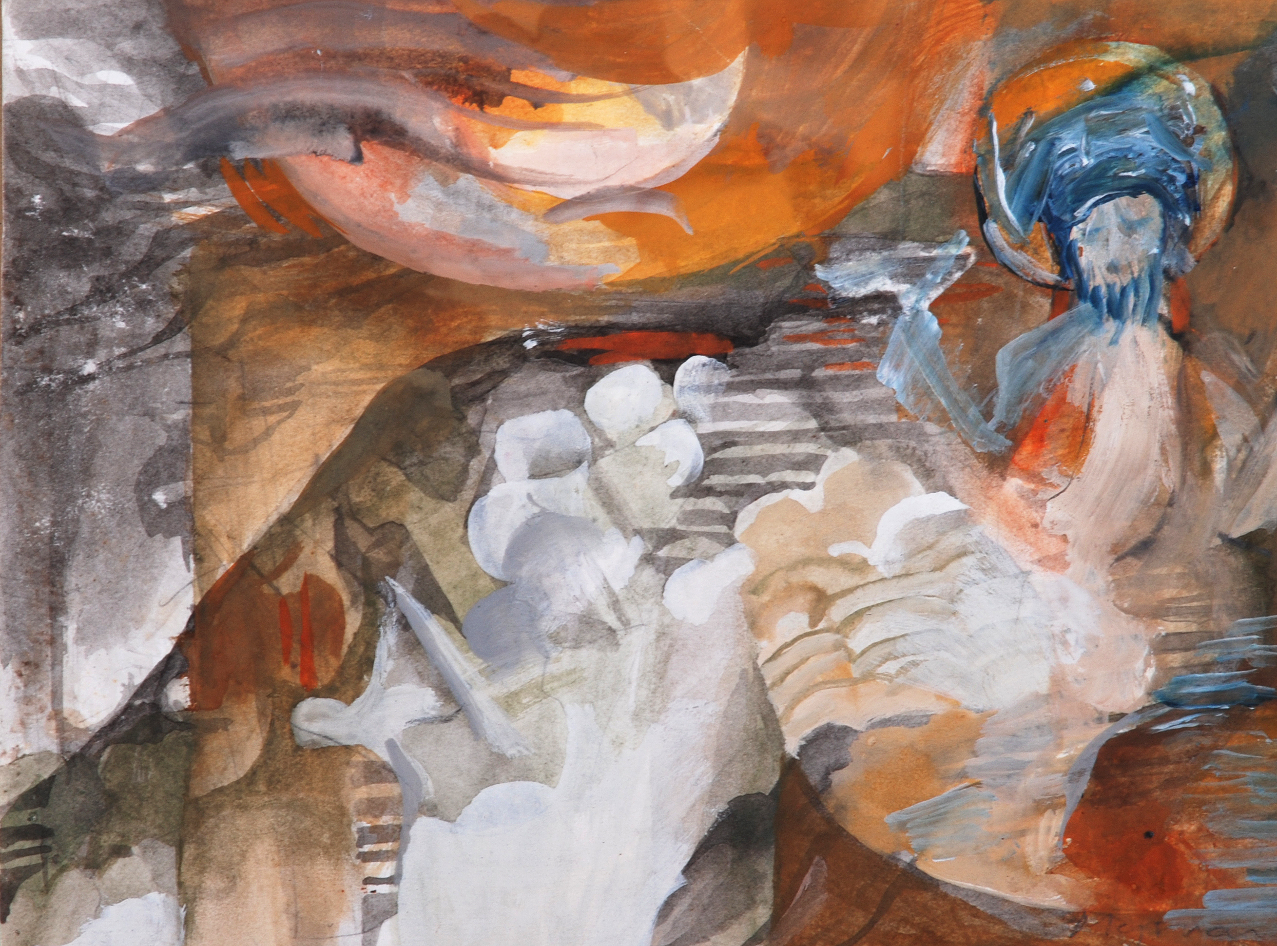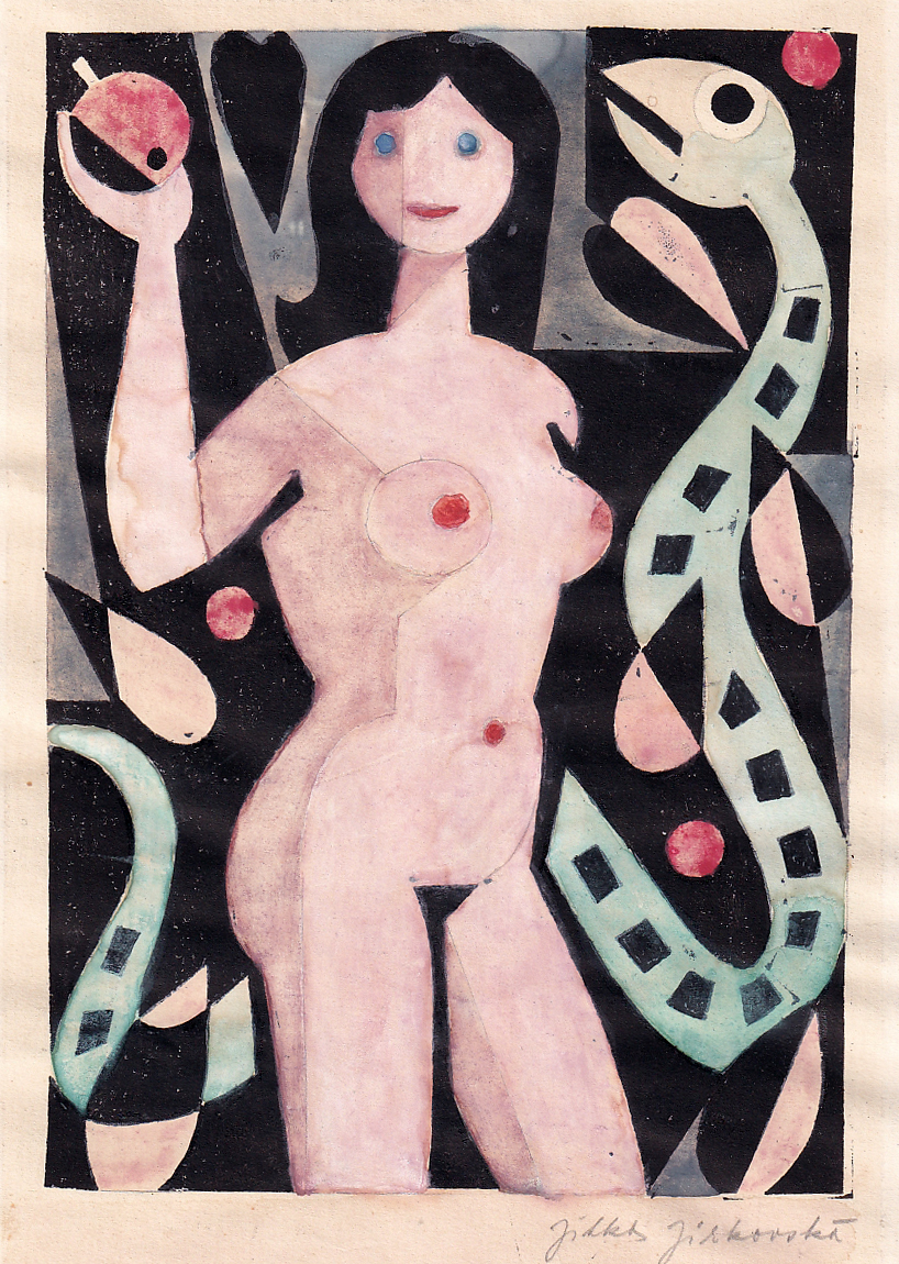 akvarel, tuš, tužka, linoryt, papír, 18 x 12,3 cm, sign. PD Jitka Jirkovská, pravděpodobně studie grafiky linorytu, Provenance: Antiquarian Dlážděná