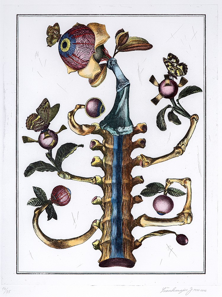 lept, ručně kolorovaný, 1975 - 2012, 64,5 x 49,5 cm, sign. PD Švankmajer J. 1975 - 2012, rám, č. 14/35, studied at The Tertiary School of Applied Arts in Prague, the disciple of prof. R. Lander at The Depatment of Puppetry at The Theatre Faculty of the Academy of Performing Arts in Prague, member of…