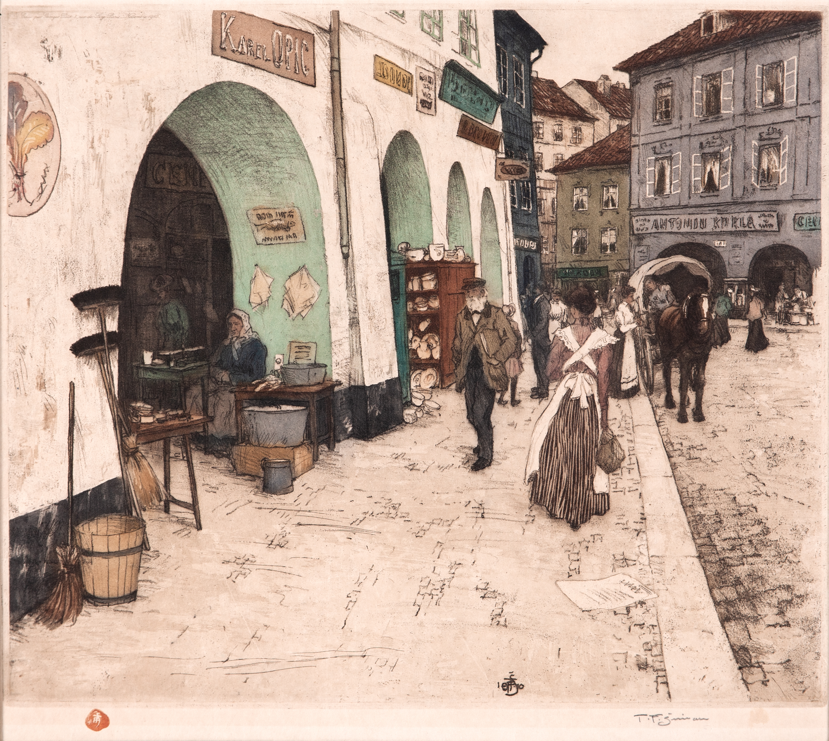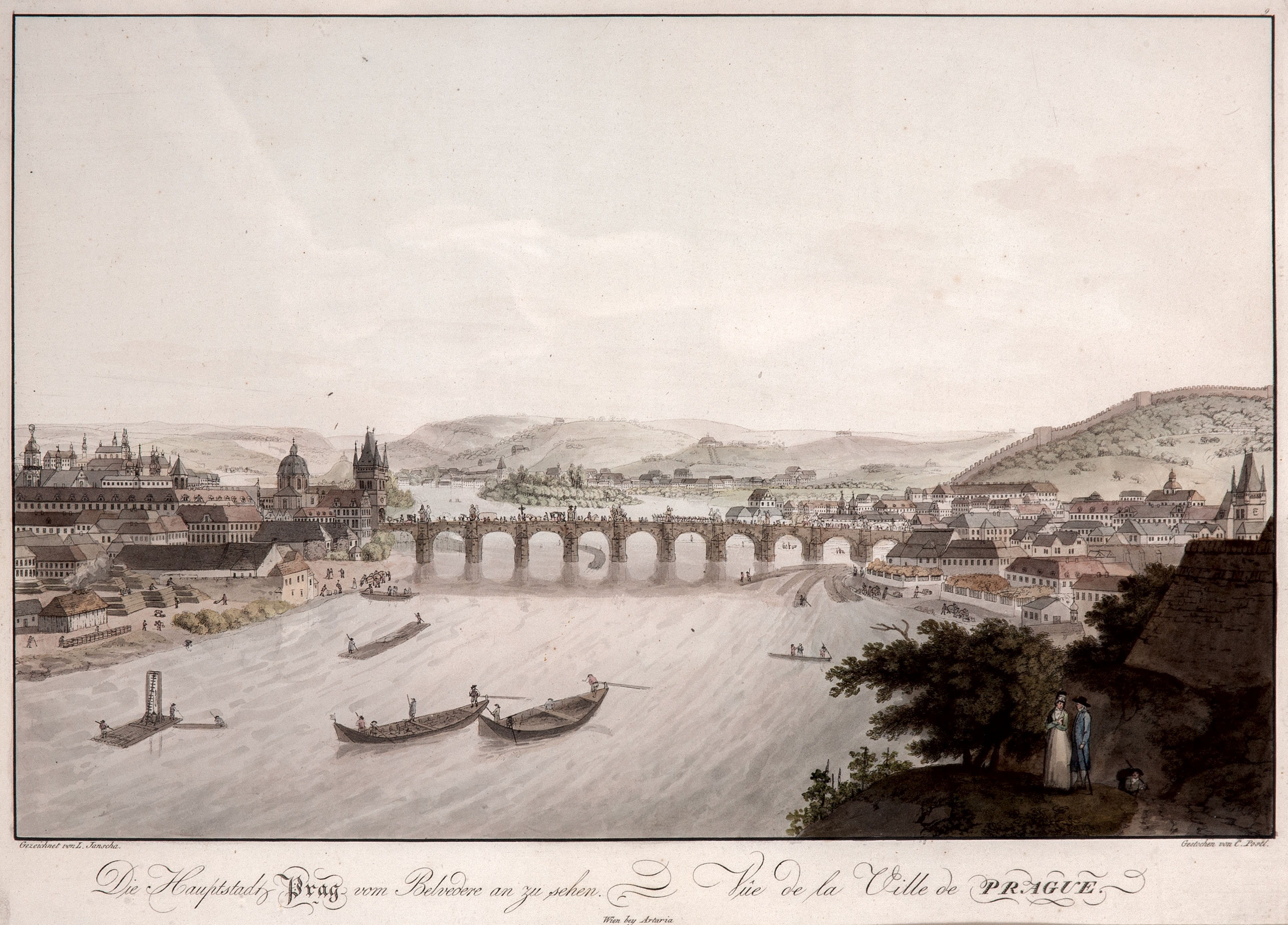 kolorovaná mědirytina, lept, 28 x 42,5 cm, značeno v tisku, rám, Die Haupstadt Prag vom Belvedere an zu sehen. Dle L. Janschovy kresby. Grafika vznikla podle kresby vídeňského malíře Lorenze Janschy (1749–1812), známého pohledy na Prahu a další středoevropská města. Do mědi ji převedl rytec Carl Pos…
