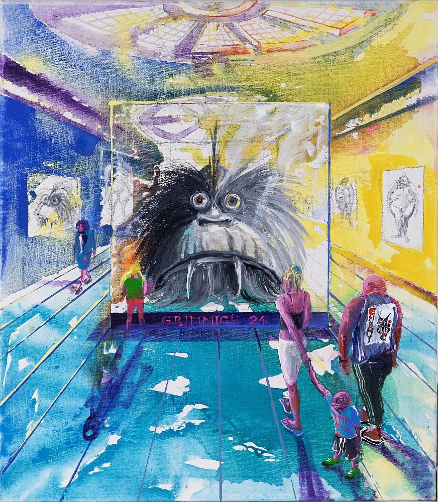 akryl, plátno, 2024, 80 x 70 cm, sign. Grimmich 24, vzadu popsáno, naše minulost či naše budoucnost? Obraz Samec námětově vychází ze série maleb věnované otázce našeho původu a evoluci. Návštěvníci muzea prochází kolem vitrín a obrazů svých předků, kteří se z původního obyvatele stali muzeálním arte…