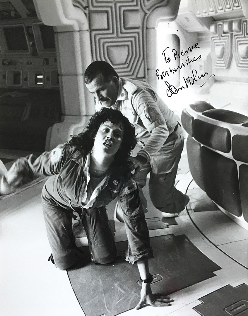 2x černobílá fotografie, 25,5 x 20,5; 25,3 x 20 cm, fotografie Sigourney Weaver signována SigrW a datována 10/8/93, fotografie Sigourney a Iana Holmana signována nečitelně