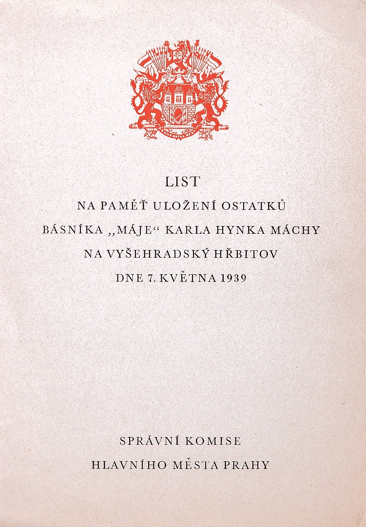 dopis, 20 x 14 cm, List na paměť uložení ostatků básníka Máje K. H. Máchy na Vyšehradský hřbitov dne 7. května 1939, s tištěnou básní Josefa Hory 7. května 1939 a vlastnoručním podpisem, vyd. Správní komise hl. m. Prahy, tisk ČGU v Praze, Antikvariát Dlážděná