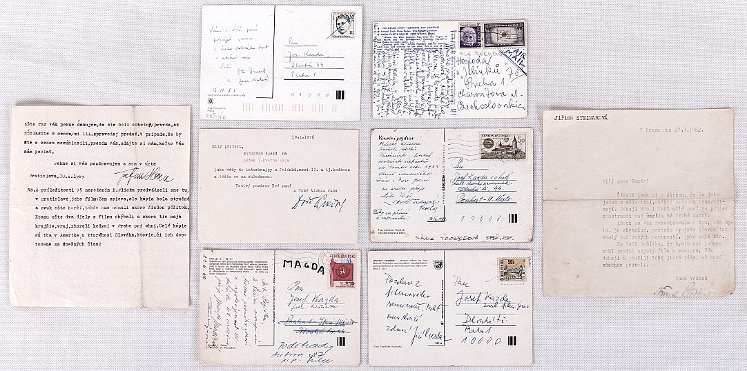 konvolut podpisů, 13 x 16 cm, podpisy a korespondence: Ota Ornest, Jana Koulová, Dóďa Pražský, Magda Maděrová, Ella Šárková, Slávka Tauberová - Veselá, Jiří Cieslar, Jiřina Steimarová a Štefan Hoza, volné pohlednice a dopisy, dobrý stav, Antikvariát Dlážděná
