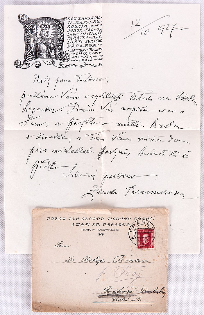 dopis, 1927, 29,3 x 23 cm, Rukopisný signovaný dopis z 12.10.1928, v původní obálce., Provenance: Antiquarian Dlážděná, disciple of S. Pinkas and A. Chittusi, member of The Manes Association of Fine Artists