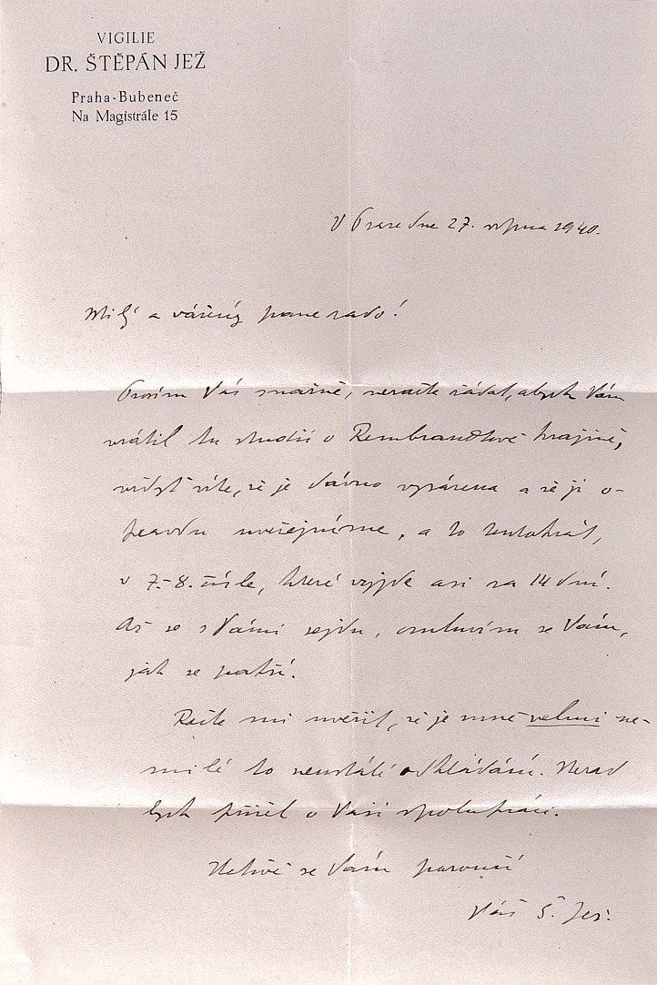 dopis, 1940, 23,5 x 15,5 cm, Rukopisný signovaný dopis z pražské Bubenče z 27. srpna 1940, bez obálky. Nakladatel, bibliofil, literární a umělecký kritik, spisovatel, výtvarný teoretik, vydavatel bibliofilií edice Vigilie a monografií Galerie., Provenance: Antiquarian Dlážděná