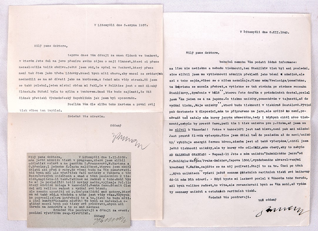 dopis, 1937-1940, 29,5 x 21,2 cm, Tři signované strojopisné dopisy, z Litomyšli 5. srpna 1937, 1.II.1939 a 8.XII.1940 Nakladatel, úředník, bibliofil, grafik, pedagog, tiskař, Provenance: Antiquarian Dlážděná