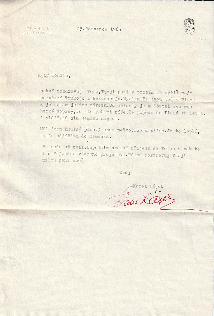 dopis, fotografie, 30 x 20,5 cm, dopis s podpisem, ruční papír Velké Losiny, r. 1965, zachovalý obálka, 6x podepsaná fotografie na zadní straně, 2x na přední straně s razídkem na zadní, 1x podepsané PF, 4x foto bez podpisu, značeno na zadní straně, dobrý stav, Provenance: Antiquarian Dlážděná