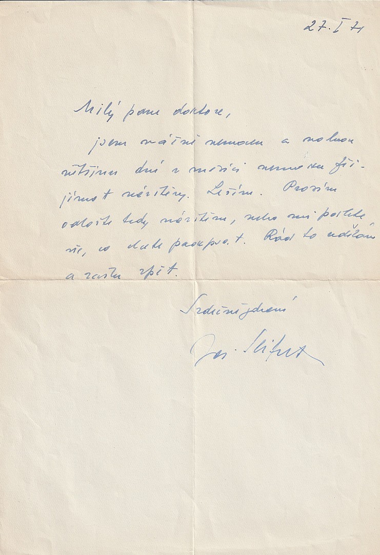 volný list, rukopis, 30 x 21 cm, ručně psaný a podepsaný dopis, r. 1971, volný list, dobrý stav, Provenance: Antiquarian Dlážděná
