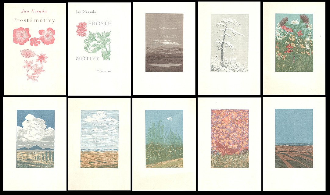 Bibliofilie, 9x celostr. bar. dřevoryt a 2x dřevoryt na pův. ob. a tit. list Fr. Kobliha?, pouze volné listy (11) k nikdy nerealizované a nevydané sbírce, na tit. listě pouze informace V Praze 1942, velmi dobrý stav, Aantiqari.at Radhošťská, , studied at UMPRUM (VŠUP, The School of Fine Arts and Cra…