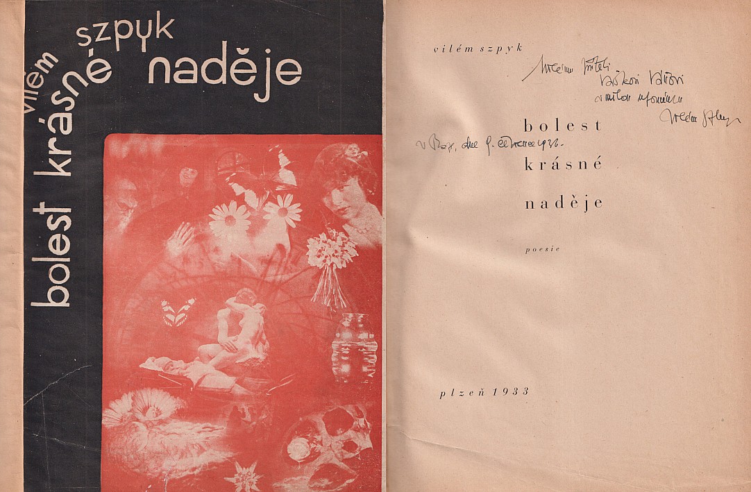 bibliofilie, básnická sbírka vizuálního experimentátora, tvůrce fotosyntézy a fotopoezie Viléma Szpyka, obálka fotomontáž, frontispis a tři básnické fotosyntézy (fotomontáže dopl. textem), podpis s věnováním na titulu V. Szpyk, sbírka obs. návod k inscenaci,vytiskla Grafická unie, vydal nákladem vla…