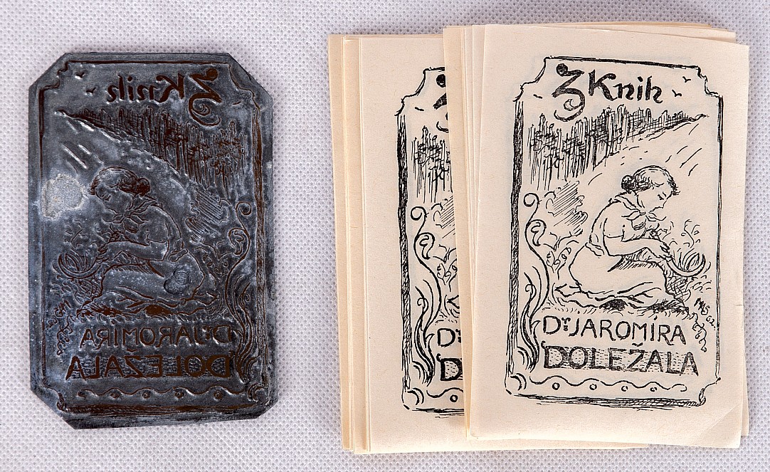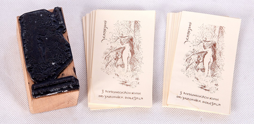 štoček a 72x ex libris, 9 x 4,5 cm, monogr. PD v desce A, kovová grafická deska pro tisk ex libris Dr. Jaromíru Doležalovi (pseudonym J. K. Pojezdný), přiloženo 72 ex libris pořízených z desky, Provenance: Antiquarian Dlážděná