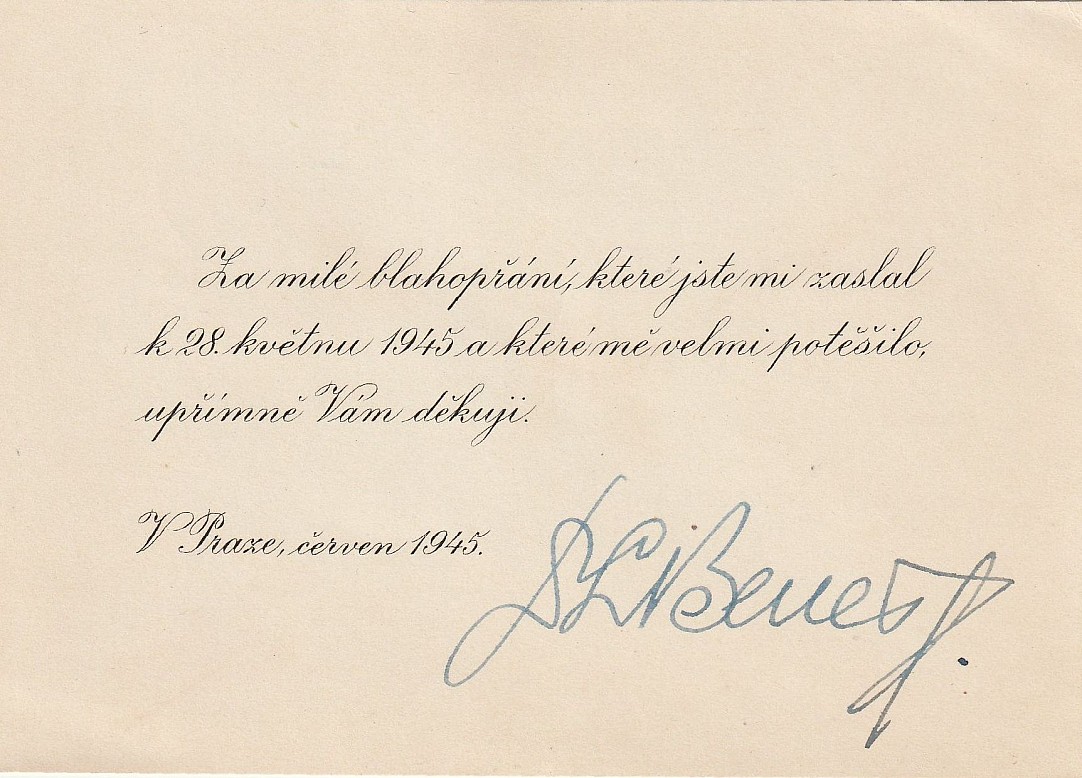 volný list, podpis, 11,5 x 15 cm, podpis na děkovném lístku, r. 1945, pův. obálka Kanceláře presidenta republiky, přiložen konvolut pohlednic a fotografií E. Bemeše, dobrý stav, Provenance: Antiquarian Dlážděná