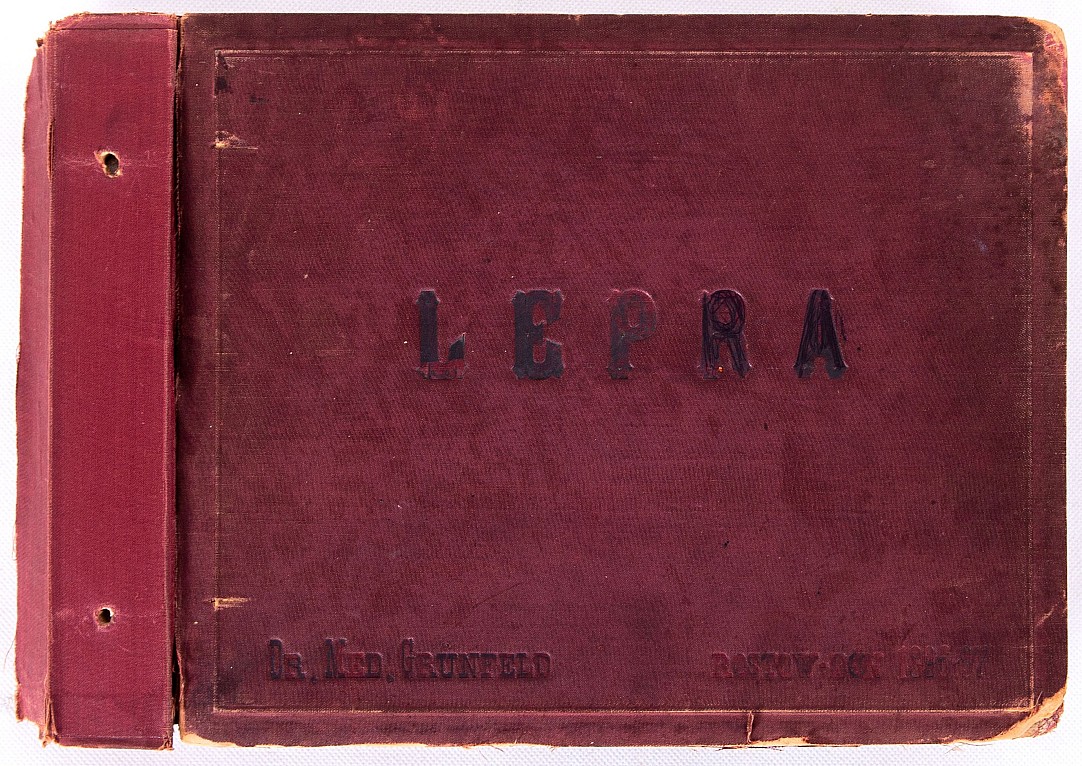 kniha, 1896-97, 23 x 32 cm, Dr. Med. Grünfeld, Rostow am Don 1896-97, na předsádce razítko Tropenmed Institut der Militärärztlichen Akademie, věnování od autora publikace Dr. A. Grünfelda profesoru Dr. P. J. Piekovi, datováno Praha 3. října 1897. Kniha obsahuje lékařskou fotodokumentaci leprotických…