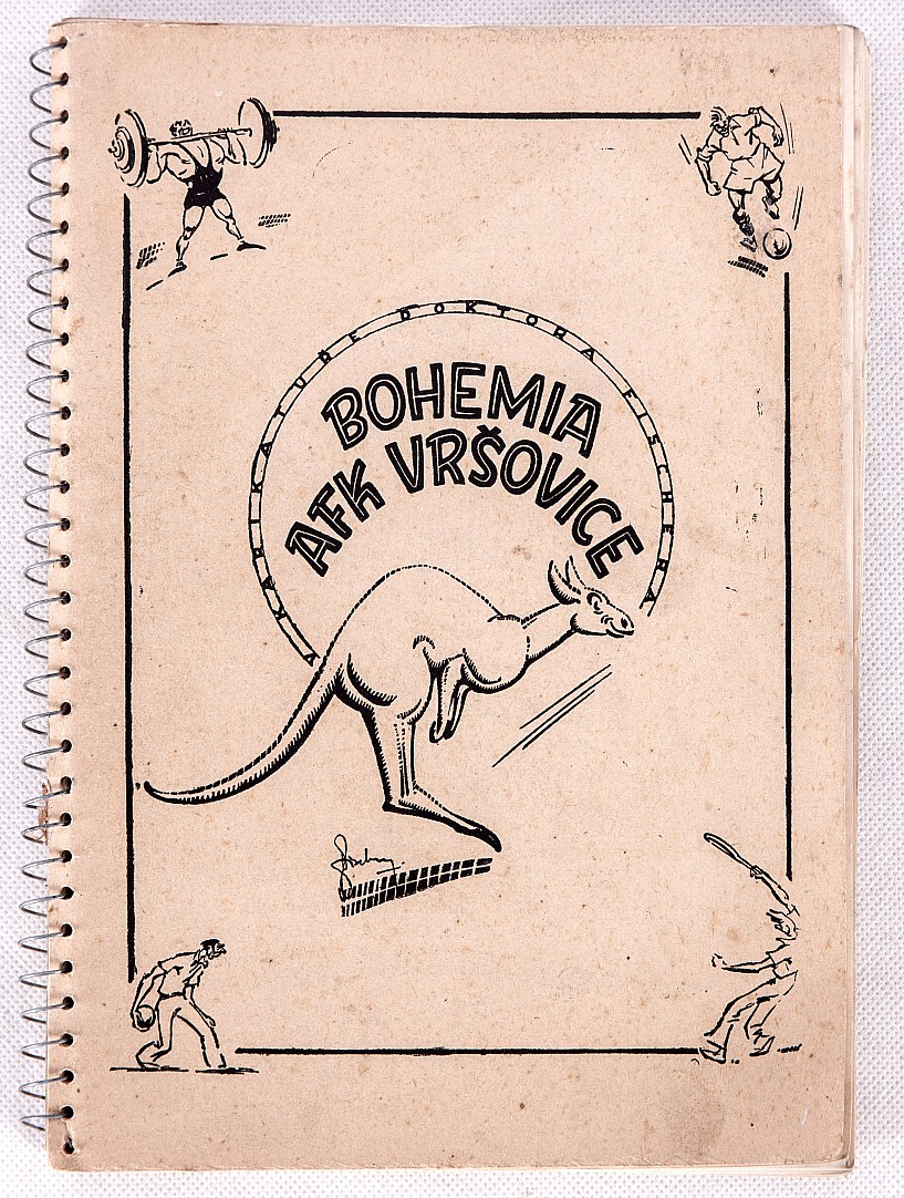 sešit, 25 x 17 cm, 55 ilustrací karikatur představitelů fotbalového klubu Bohemians Praha, r. 1945, velké množství dobových reklam, kroužková vazba, dobrý stav, Provenance: Antiquarian Dlážděná, painter and draughtsman, grandson of Hugo Boettinger, renowned especially as teh author of the cartoon Ry…