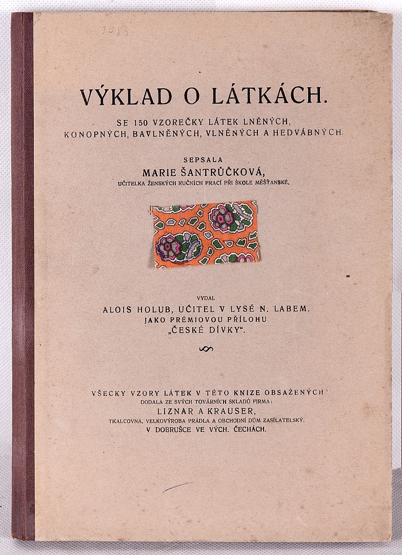 kniha, 25 x 18 cm, kniha se 150 vzorečky látek lněných, konopných, bavlněných, vlněných a hedvábných, látky obsažené v knize dodala firma Liznar a Krauser, vyd. A. Holub, Lysá nad Labem, 1925, pevná vazba, 54s, ustřižena polovina vzorečku č. 141. Satin de chine a vzorek č. 152. čínská tráva, velmi d…