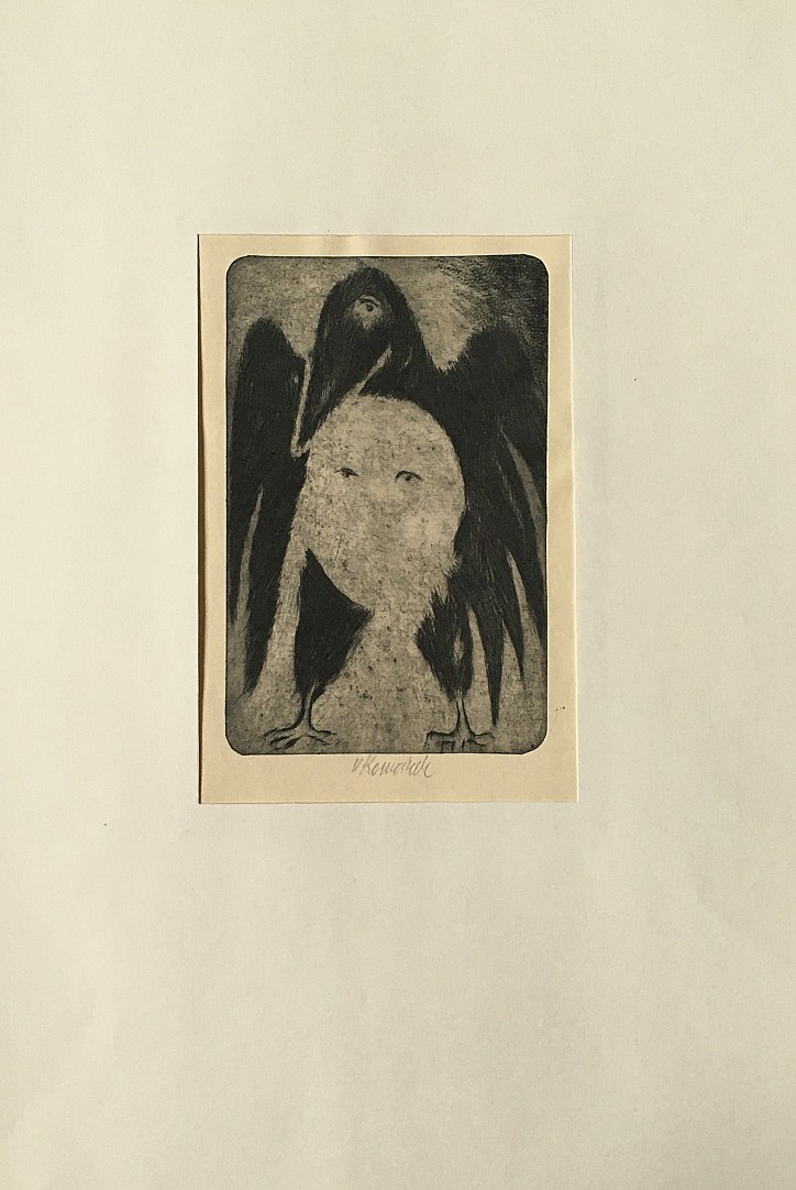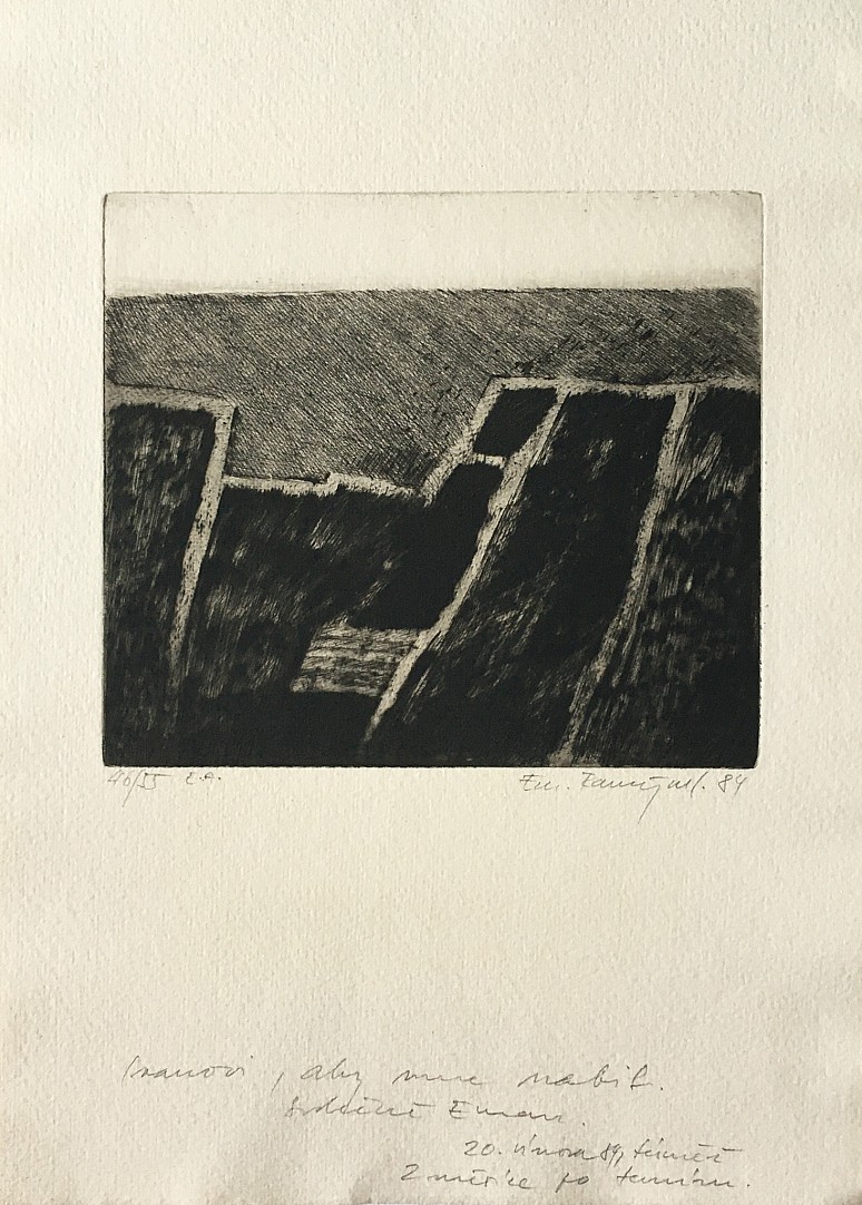 suchá jehla, 1984, 13,5 x 15,5 cm, sign. PD Em. Ranný 84, č. 46/55, dole věnování Ivanu Hrdinovi