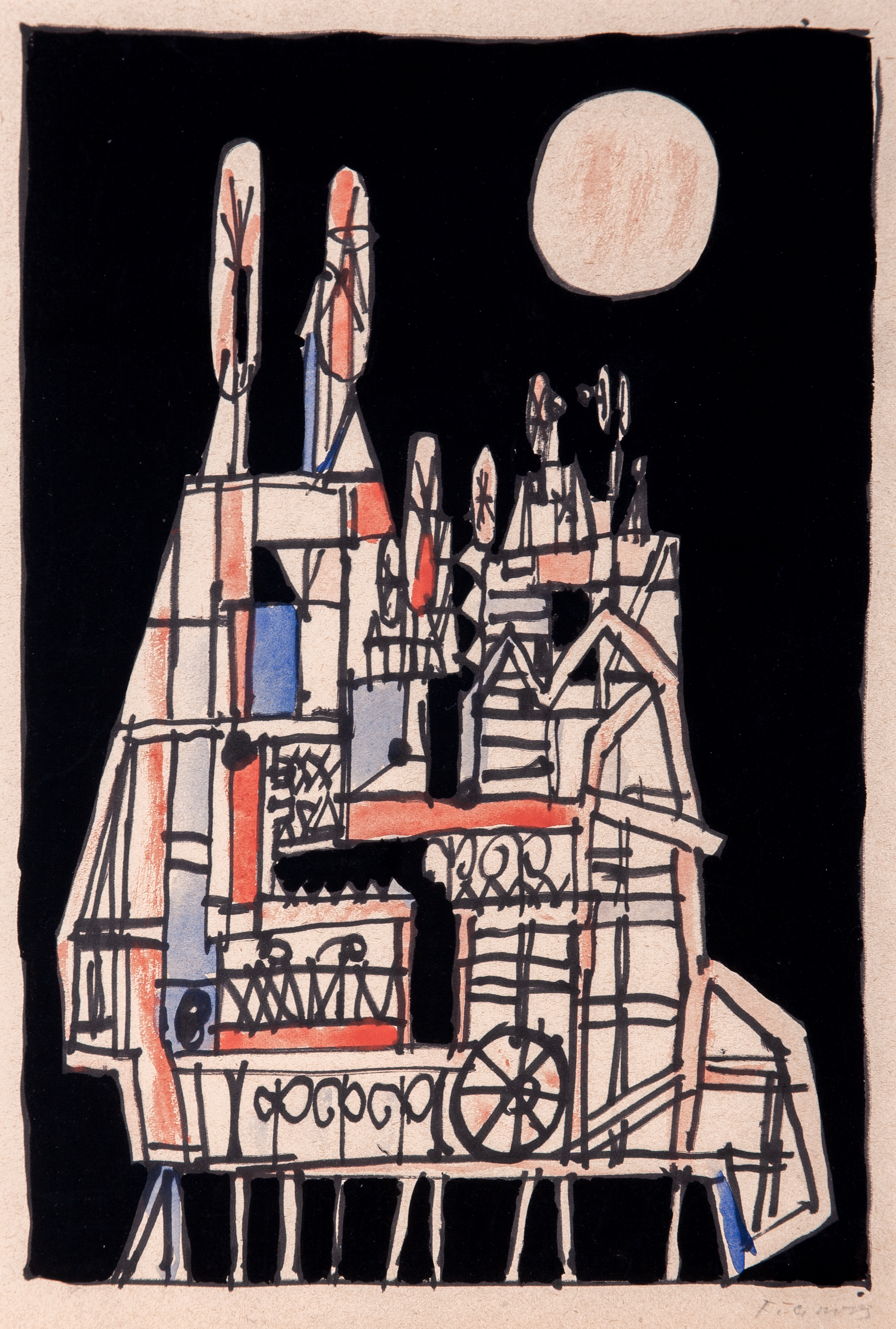 akvarel, pastel, papír, 29 x 20,5 cm, sign. PD F. Gross, rám, autor byl členem Skupiny 42, skupiny RADAR, a v 60. letech Československo úspěšně reprezentoval na Benátském bienále. Jeho magickorealistická malba z válečných let i pozdější malba s geometrickými prvky patří k vrcholům soudobého tuzemsk…