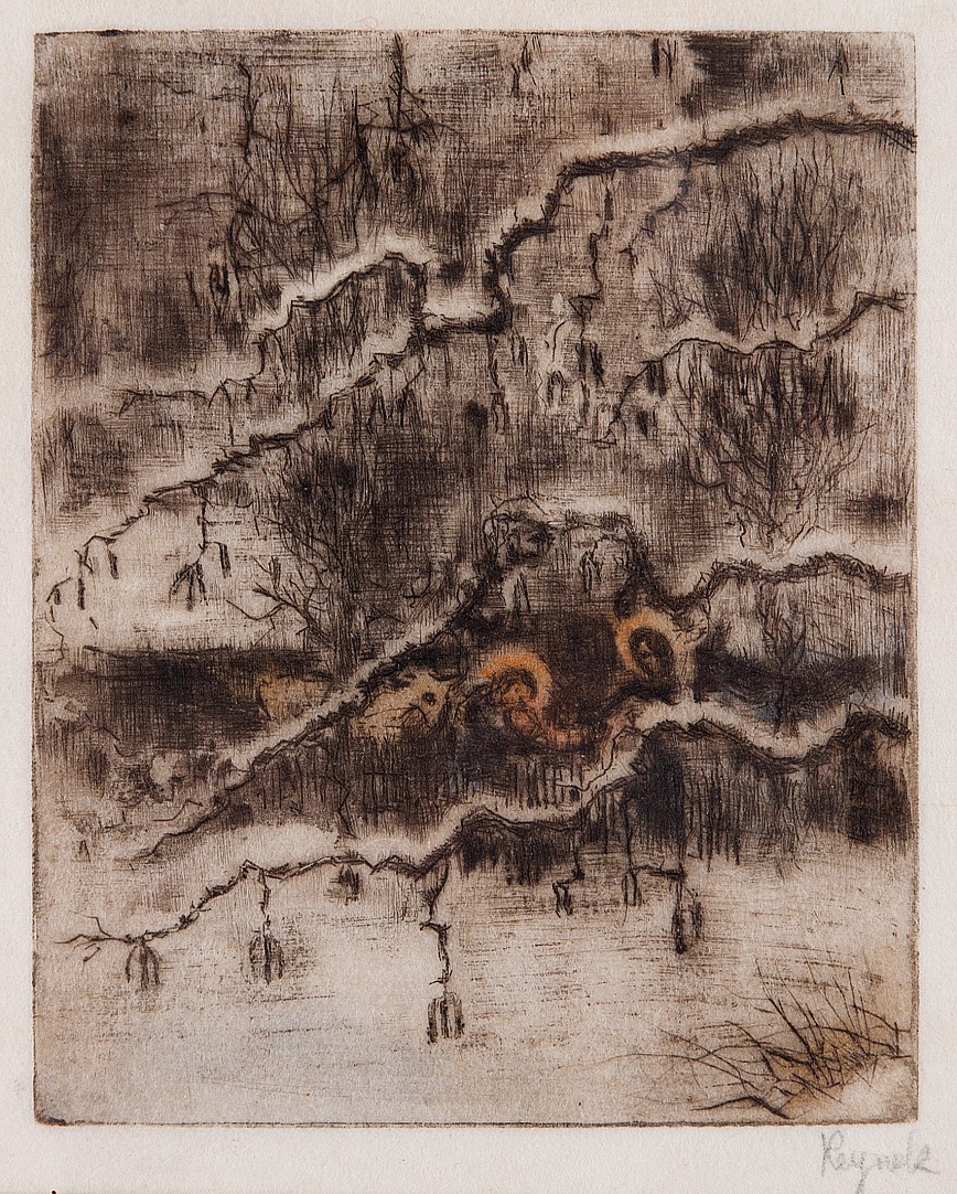 suchá jehla, 1947, 12,5 x 9 cm, sign. PD Reynek, rám, z Cyklu 12 suchých jehel " Pastorale" vydaný V. Vokolkem v popisek: Z 1947. Desky z cyklu byly ryty již dříve, v letech 1942-45, tištěny pak a vydány v. roce 1947., soukromé studium, člen SČUG Hollar, Svazu čsl. výtvarných umělců a Synd…