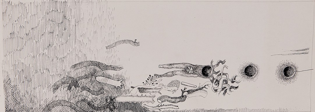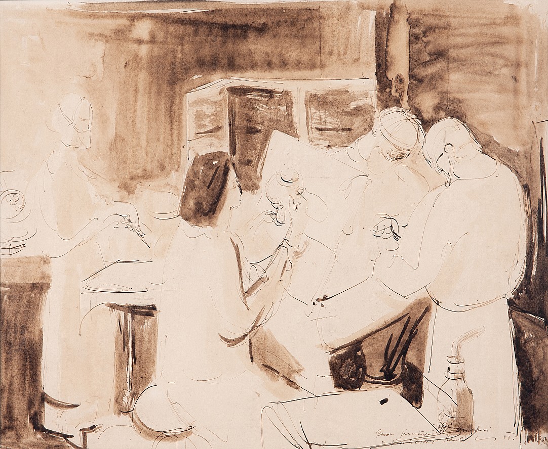 perokresba, tuš, papír, 29 x 56,5 cm, přilepeno hnědou lepenkou na podkladový papír, žák prof. M. Holého a K. Součka na AVU v Praze, člen Umělecké besedy, SVU Mánes, Sdružení pražských umělců - malířů