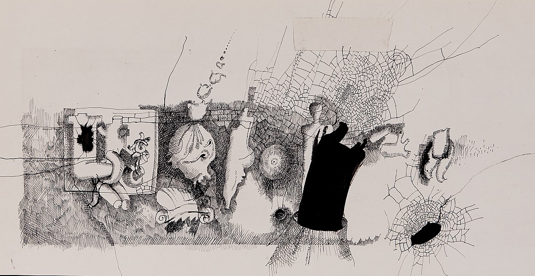 tuš, olej, papír, 1980, 24,7 x 35 cm, sign. vzadu Jiří Mrázek 1980