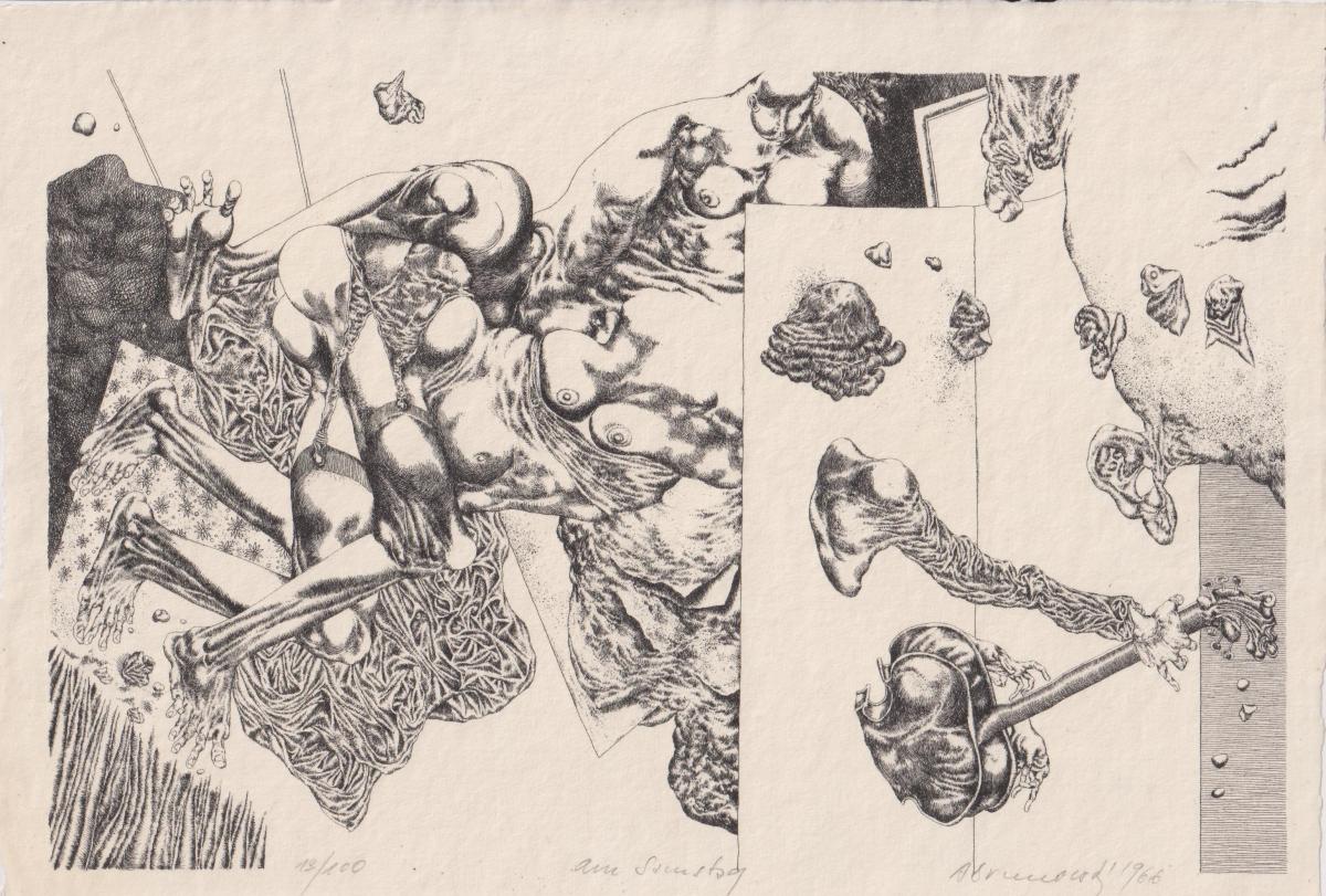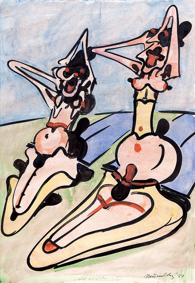 akvarel, tuš, papír, 1977, 50 x 35 cm, sign. PD Načeradský 77, posouzeno kurátorem a správcem umělecké pozůstalosti autora Petrem Machem, Antikvariát Ostrovní, žák prof. V. Rady na AVU v Praze, člen Volného sdružení 12/15
