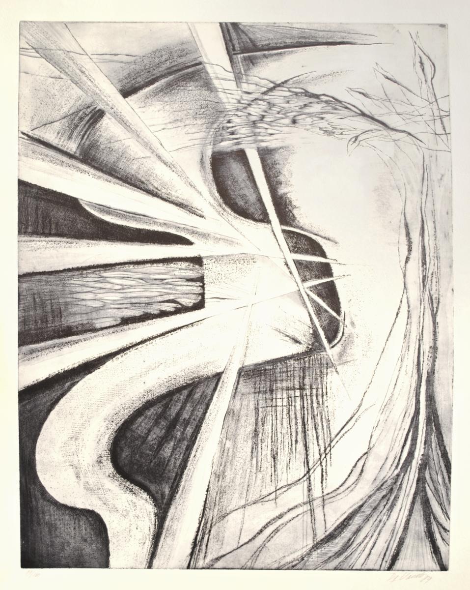 litografie, 27,5 x 46 cm, sign. PD Ilona Vodochodská 89, autorský tisk, Antikvariát Ostrovní, žákyně prof. L. Čepeláka na AVU v Praze