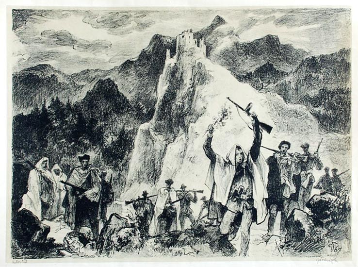 litografie, 1964, 33,7 x 44,7 cm, sign. PD J. Vodrážka, autorský tisk, mírně zašpiněný papír, v rozích malé dírky, žák prof. E. Dítěte a F. Kysely na VŠUP v Praze, poté M. Švabinského na AVU v Praze, člen Umělecké besedy a SČUG Hollar