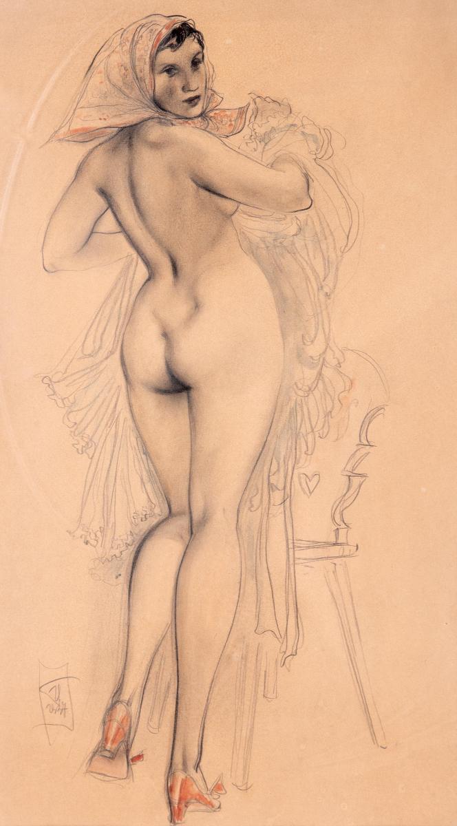 kresba uhlem, akvarel, papír, 51 x 29 cm, sign. LD, pasparta, rám, Aantiqari.at Radhošťská, , disciple of Prof. J. Obrovský at the Academy of Fine Arts in Prague