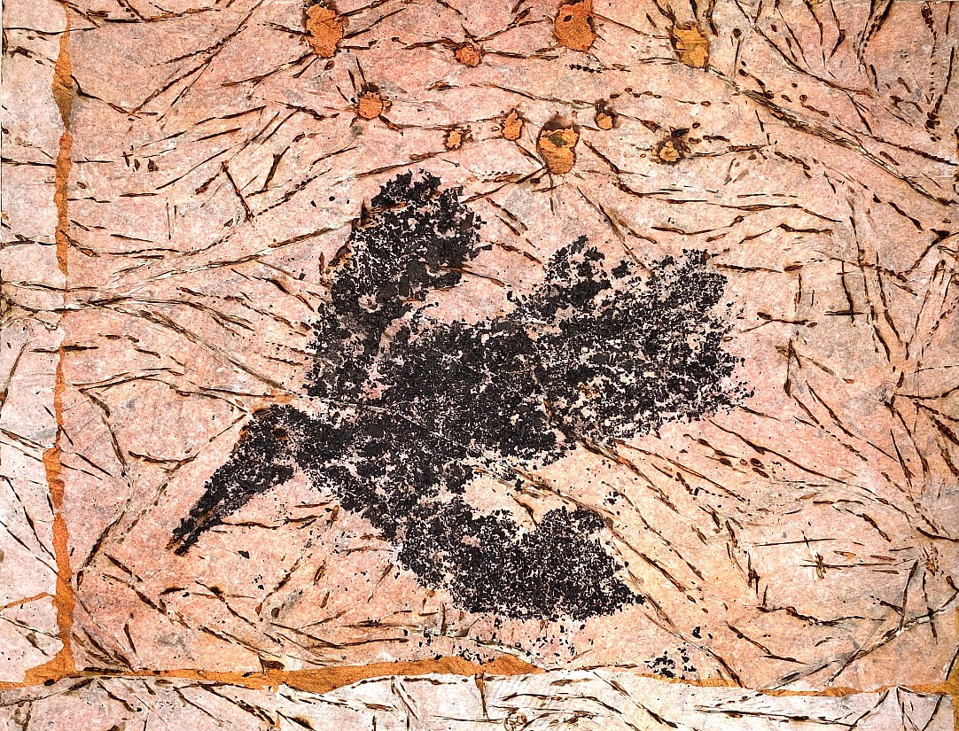 papír, oheň, popel, OSB deska, 2019, 35 x 45 cm, sign. DU K, the disciple of A. Paderlik, constituent member of the group AFTEC