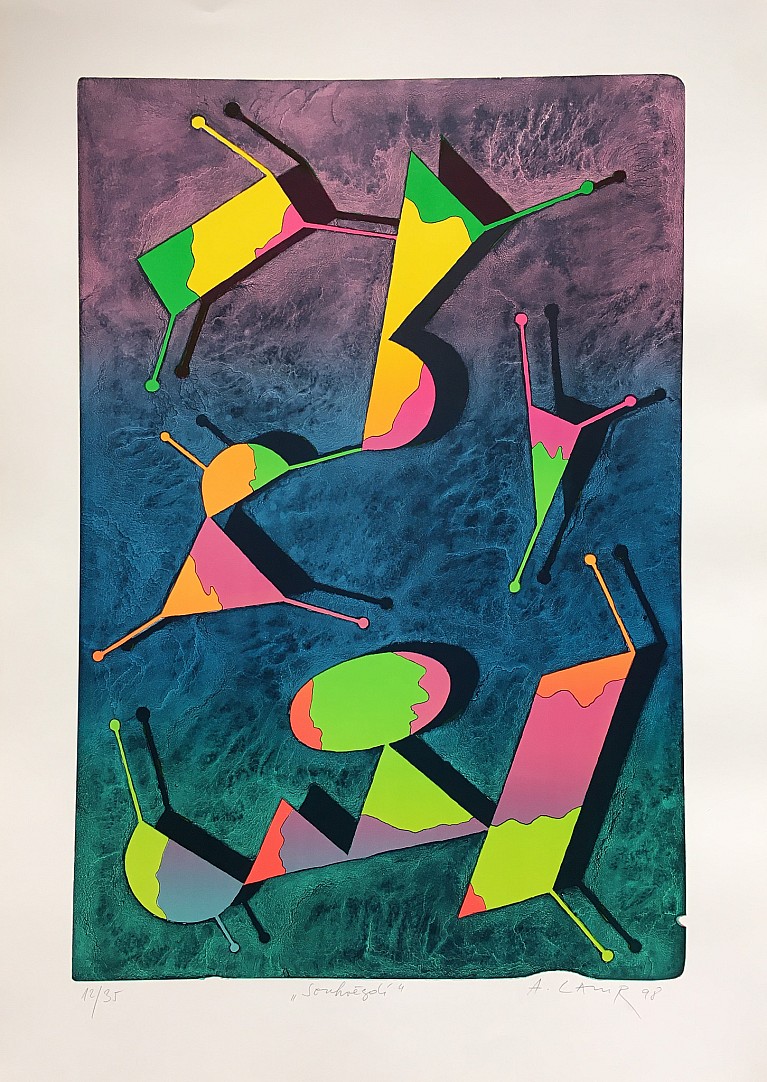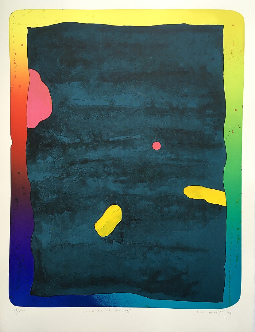 akvarel, tuš, papír, 2004, 55 x 74 cm, sign. DU A. Lamr 04, typická koloristicky výrazná práce od významného představitele českého Pop-artu, který je svým osobitým dílem zastoupen mj. ve sbírkách National Gallery of Art ve Washingtonu, Centre G. Pompidou v Paříži, Museo de Arte Contemporáneo v Bueno…