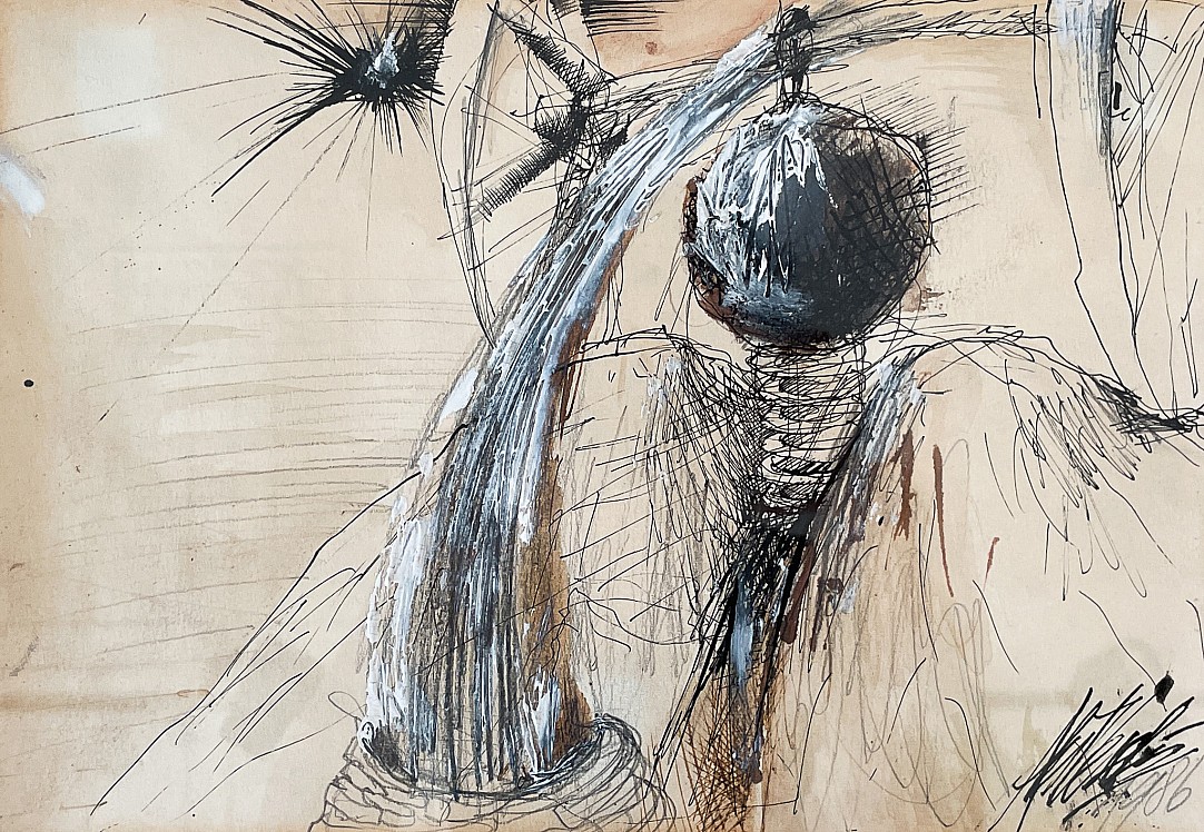 tuš, běloba, kombinovaná technika, papír, 1986, 20,5 x 29 cm, sign. PD A. Veselý, rám