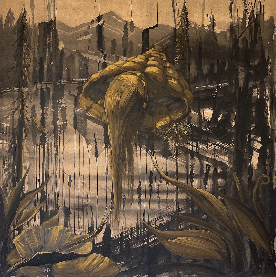tuš, akryl, sololit, 2021, 100 x 100 cm, sign. vzadu Igor Grimmich, Igor Grimmich je umělec, který tíhne k expresivitě, reálnému zobrazování a narativitě. Během svého studia na Akademii výtvarných umění začlenil do své volné tvorby systém sociální grotesky, který mu umožňuje reagovat na různé typy k…