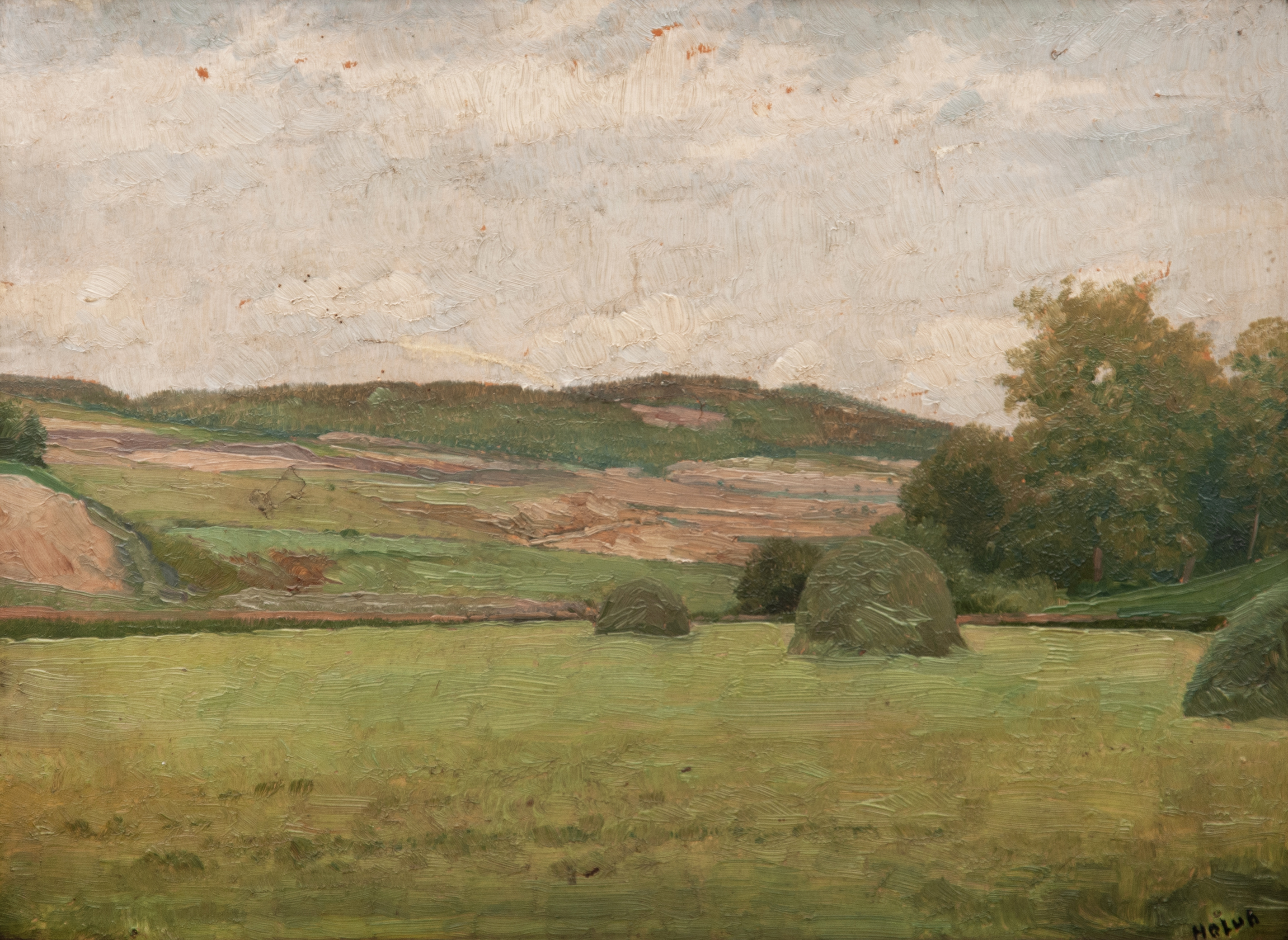 olej, karton, 20 x 26,5 cm, sign. PD Holub, rám, konzultováno a ověřeno PhDr. Michaelem Zachařem, konzultováno a ověřeno PhDr. Michaelem Zachařem, český krajinář, jeden z posledních žáků Julia Mařáka na pražské Akademii výtvarných umění, který do 20. století přenesl poučení jeho precizní kresbou a b…