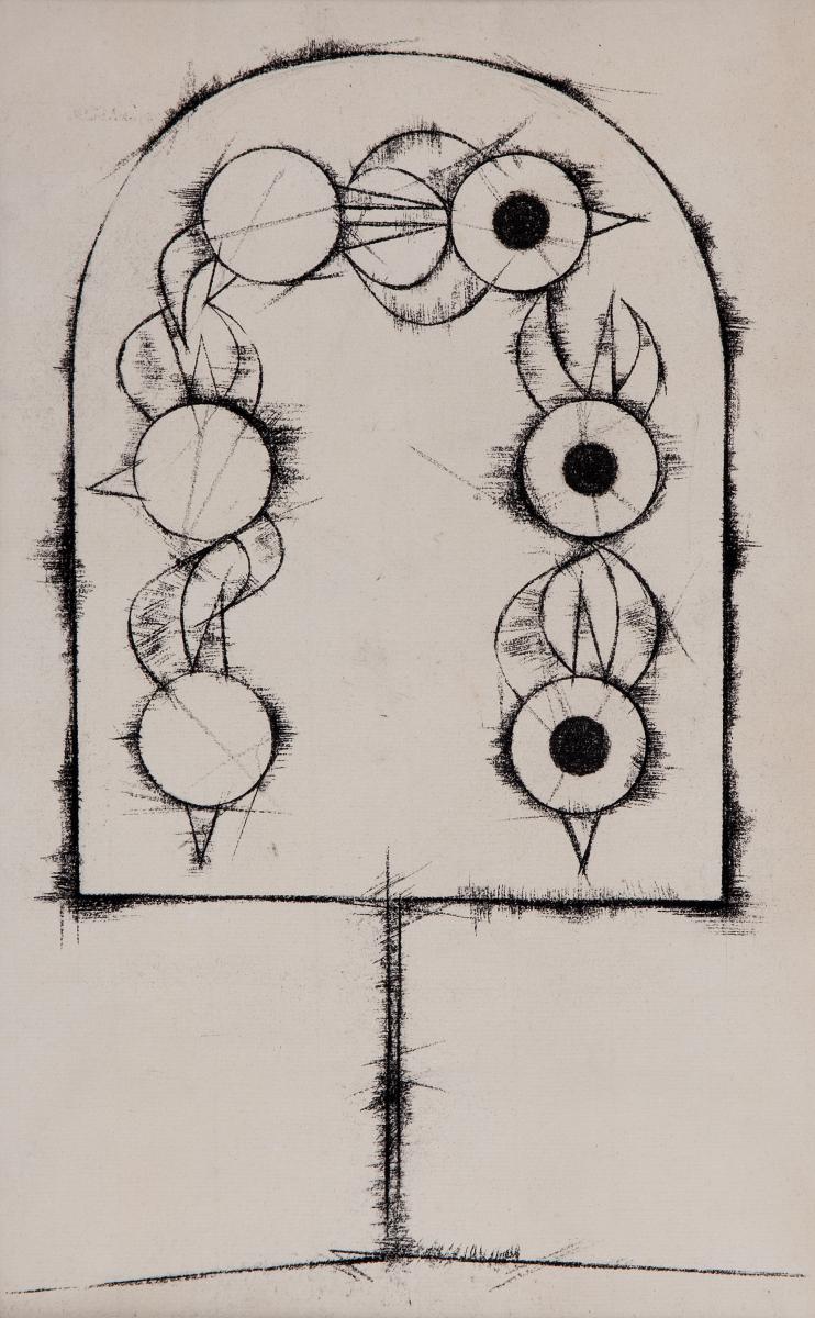 uhel, papír, 34,5 x 22,2 cm, dole popsáno, the disciple of prof. K. Muller, V. Rada, F. Muzika and F.Tichy