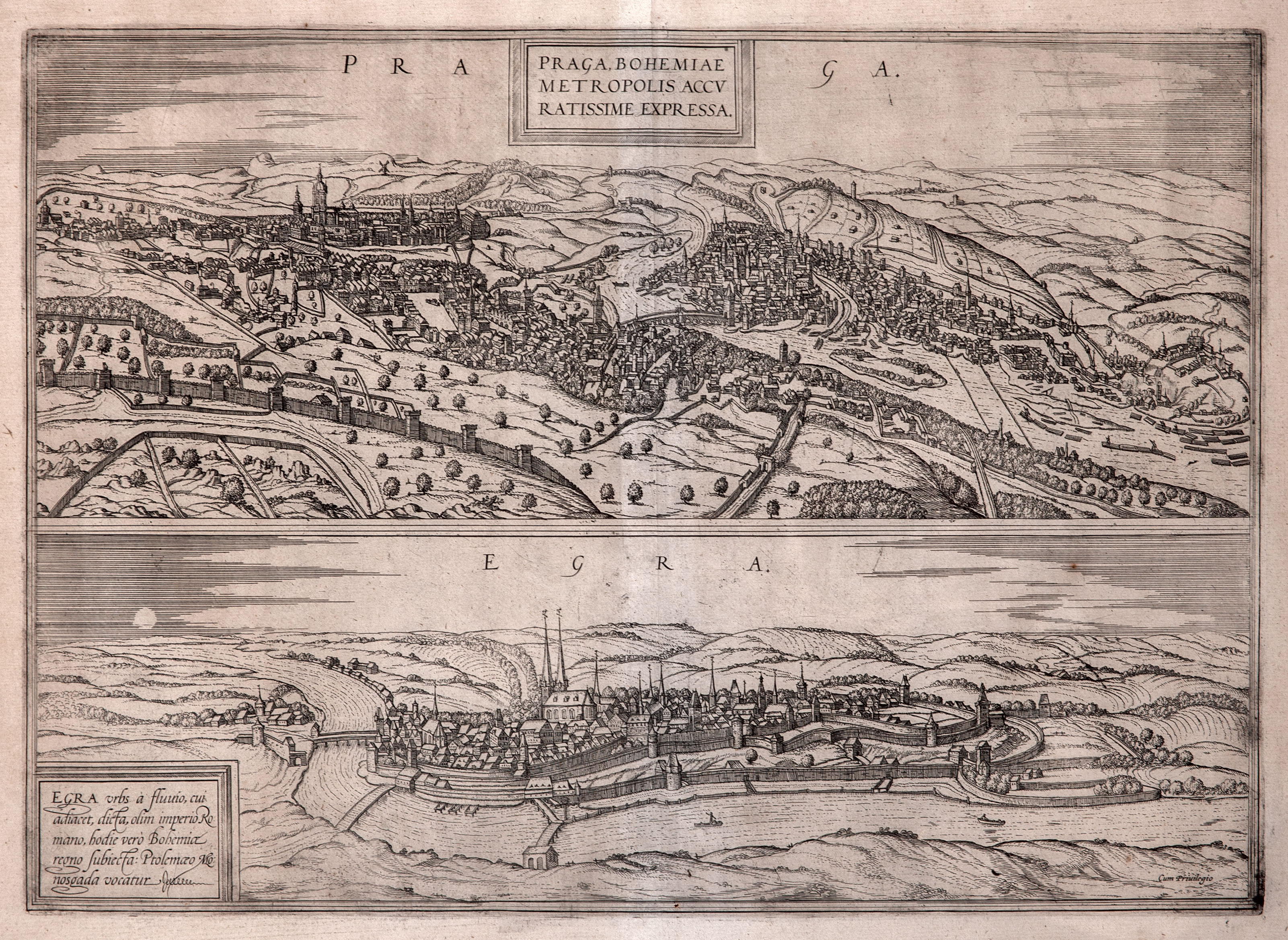 mapa - mědirytina, 16. st., 34 x 47 cm, rám, původní mědiryt, G. Braun,F. Hogenberg, 1574. Georg Braun (1541–1622), Franz Hogenberg (1535–1590): Praga, Bohemiae metropolis accuratissime expressa / Egra z díla Civitates Orbis Terrarum, Kolín nad Rýnem 1572, mědirytina. Veduta s panoramatickým pohled…