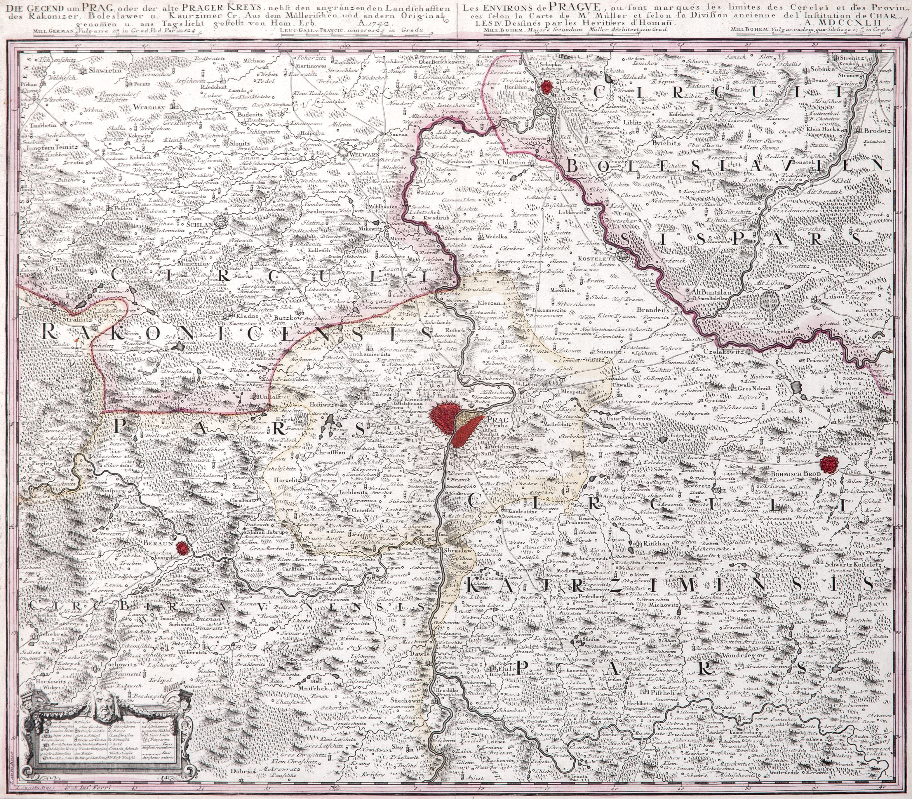 mapa - mědirytina, 51,5 x 58 cm, rám, mapa z dílny Homannových dědiců zobrazuje Pražský kraj a jeho okolí v 18. století. Dílo představuje významný kartografický pramen Habsburské monarchie a jeden z nejdetailnějších dobových pohledů na region s Prahou jako centrem. Homannovi dědicové (Homann Erben) …